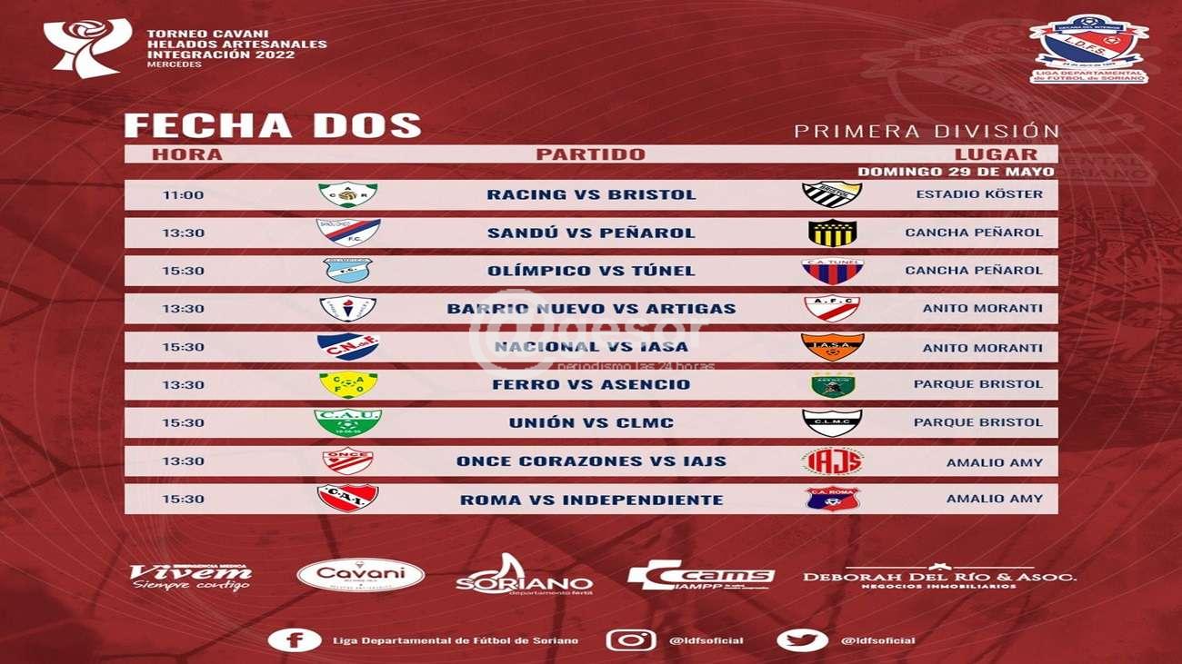La fecha de primera va con los siguientes partidos, el domingo hora 11 Racing y Bristol va en el Koster y es el televisado, Sandú vs Peñarol hora 13 y 30 y Olímpico vs Tunel hora 15.30 en cancha de Peñarol. En el Anito Moranti Barrio Nuevo vs Artigas a la hora 13, y Nacional vs IASA hora 15 y 30. En el Parque Bristol juegan Ferro vs Asencio, y Unión vs CLMC, con los mismos horarios de las demás canchas.