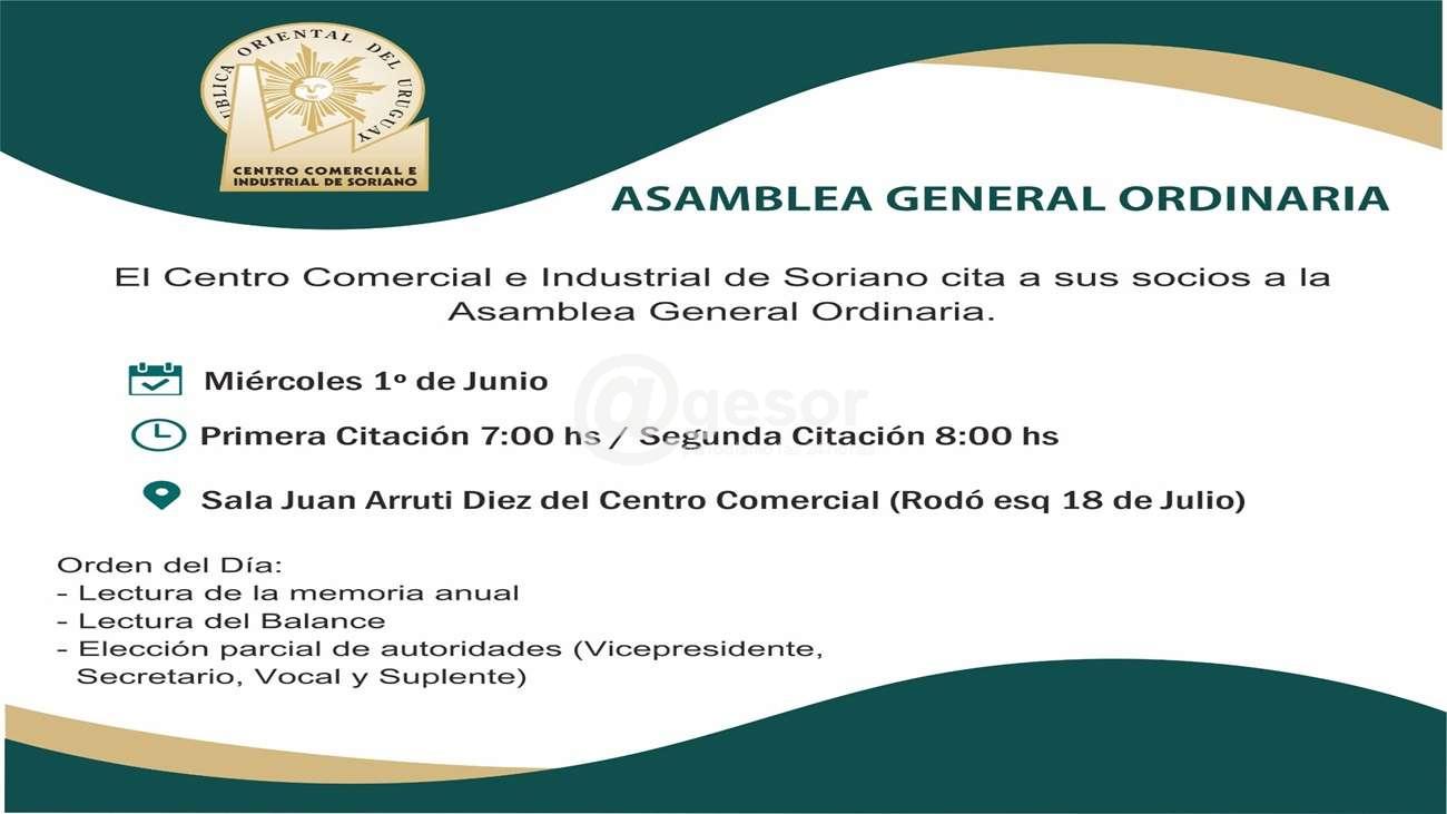 El Centro Comercial de Soriano realiza su Asamblea general ordinaria. Será el  1 de junio próximo con una primera citación prevista para las 7 horas, y un segundo llamado a las 8 horas.
