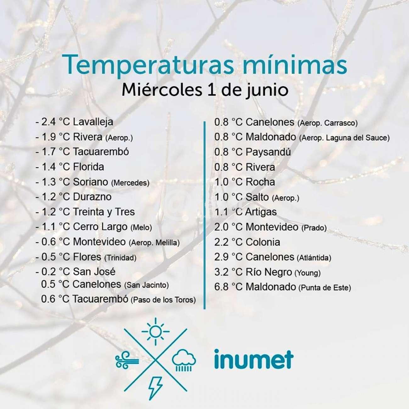 INUMET dio a conocer los registros de temperaturas mínimas en cada una de las estaciones meteorológicas correspondientes a este miércoles 1 de junio, volviendo a ser Lavalleja la que registró el guarismo mínimo a nivel nacional con 2.4ºC bajo cero, siguiéndole el aeropuerto de Rivera con 1.9ºC bajo cero, en tercer término Tacuarembó con 1.7ºC bajo cero, cuarto lugar fue para Florida con 1.4ºC bajo cero y en quinto término Mercedes con 1.3ºC bajo cero.