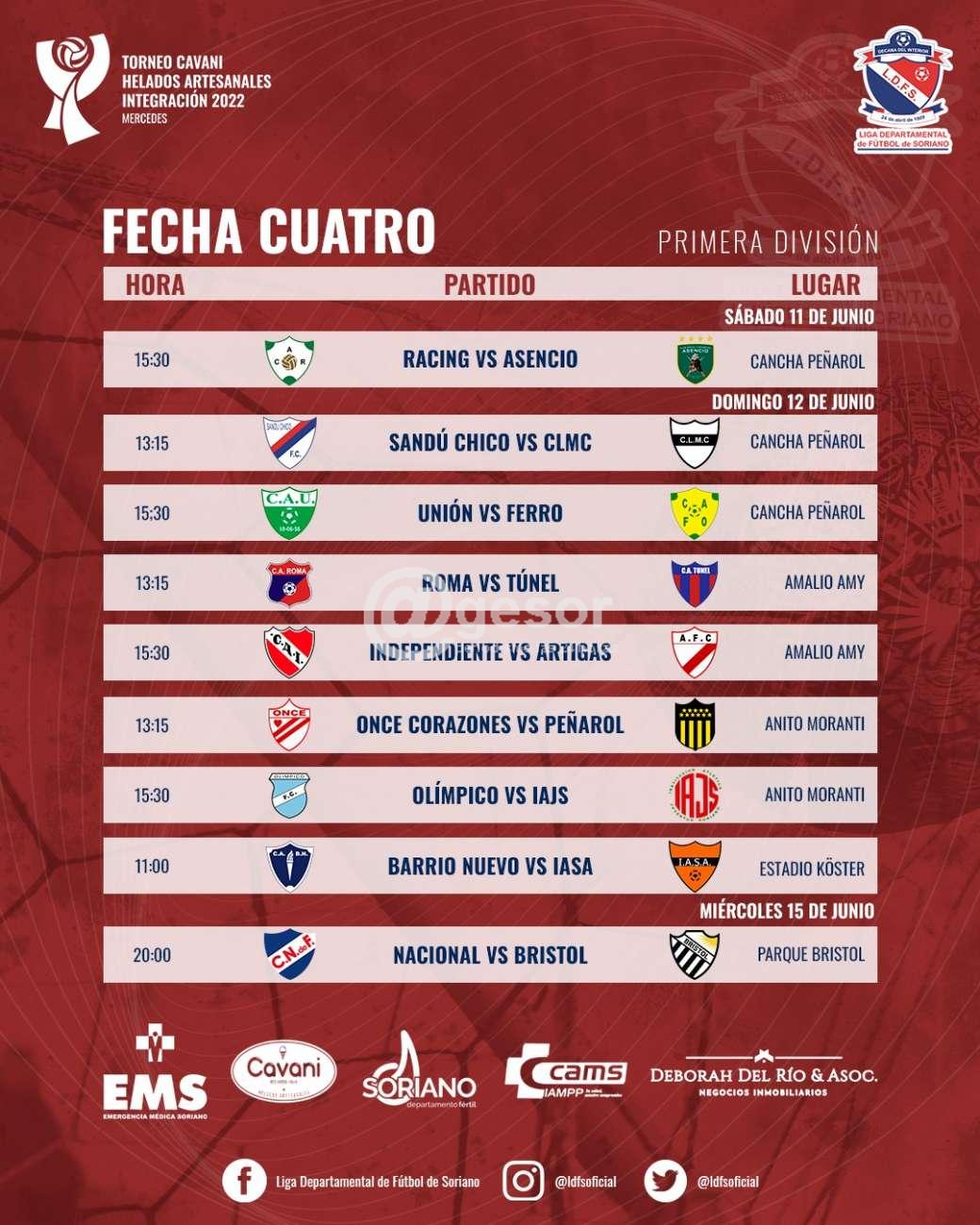 Continuando con la reunión, se fijó la cuarta fecha con grandes equipos, el sábado se miden en cancha de Peñarol vs Asencio a la hora 15 y 30, este partido se jugará ese día a solicitud de Asencio ya que estará celebrando un nuevo aniversario. El Domingo en cancha de Peñarol a primera hora, 13 y 15 juegan Sandú vs CLMC, y a las 15 y 30 Unión vs Ferro. En el Amy, a primera hora juegan Roma vs Túnel y a segunda hora Independiente vs Artigas. En el Moranti, a primera hora Once Corazones vs Peñarol y a segunda hora Olímpico vs el local Juventud.