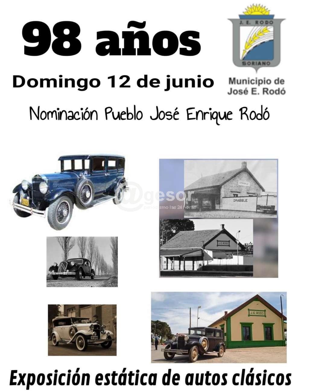 Este domingo 12 con la organización del Municipio local, se realiza el acto de nominación de Pueblo José Enrique Rodó, en el marco de la celebración de los 98 años, rumbo al centenario, a partir de las 10.00 horas en el predio de estación AFE habrá exposición estática de autos clásicos.