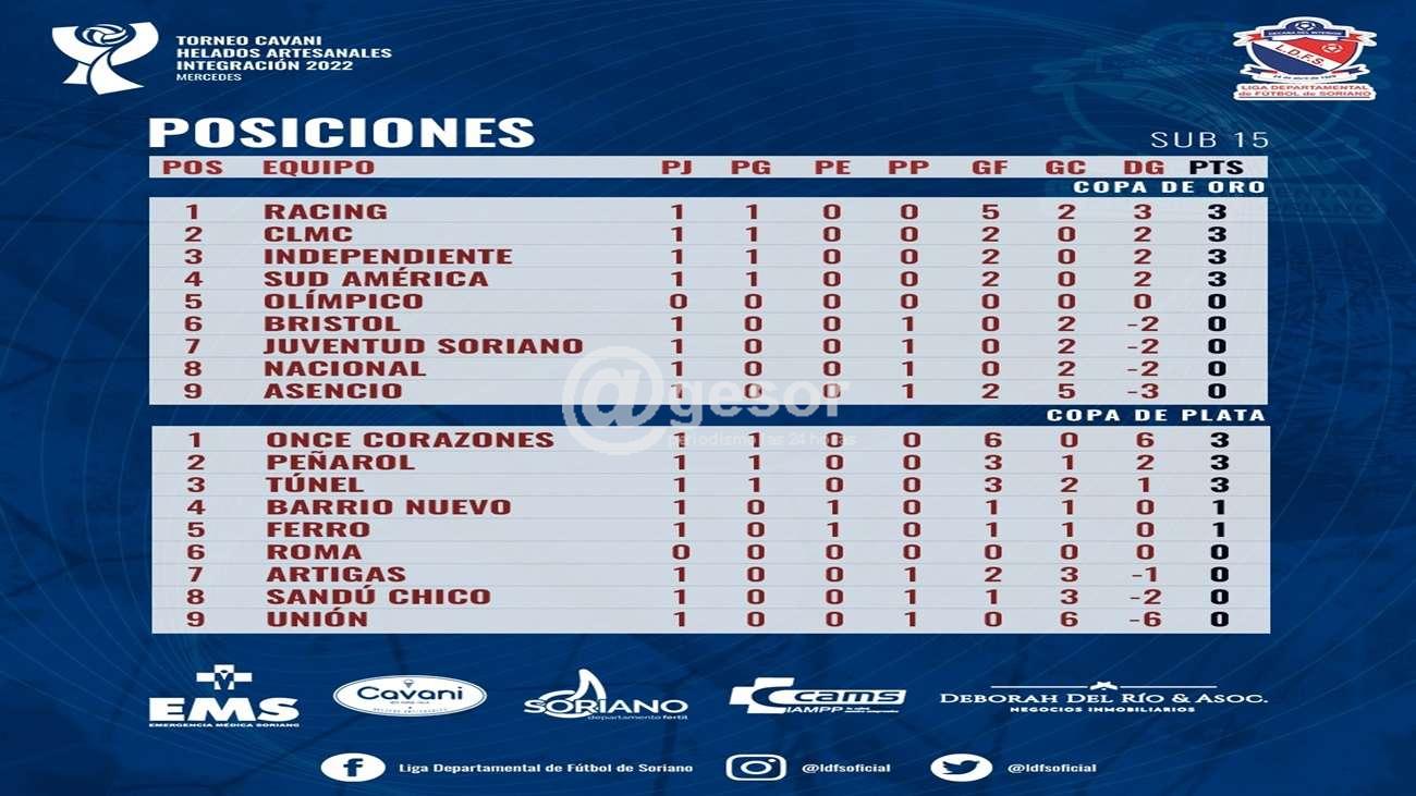La tabla de posiciones marca  que lideran la copa de ORO Racing, CLMC, Independiente y Sud América con 3 puntos, siguen sin unidades Olimpico, Bristol, Juventud, Nacional y Asencio.