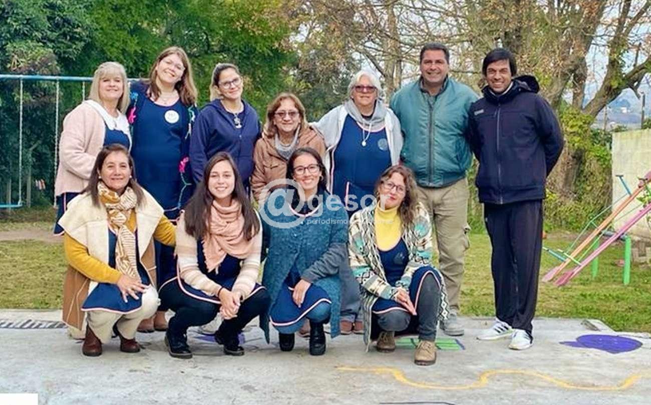 En la fotografía de izq. a der. se encuentran: parados Maestra turno vespertino Andrea Razquin, Psicóloga Florencia Gramajo, Auxiliar Eugenia Cuesta, Admnistrativa Amparo Marcelino, Educadora del turno matutino Gilda Angelino, Mantenimiento Johny Duarte, Profesor Educación Física Luis Maciel.