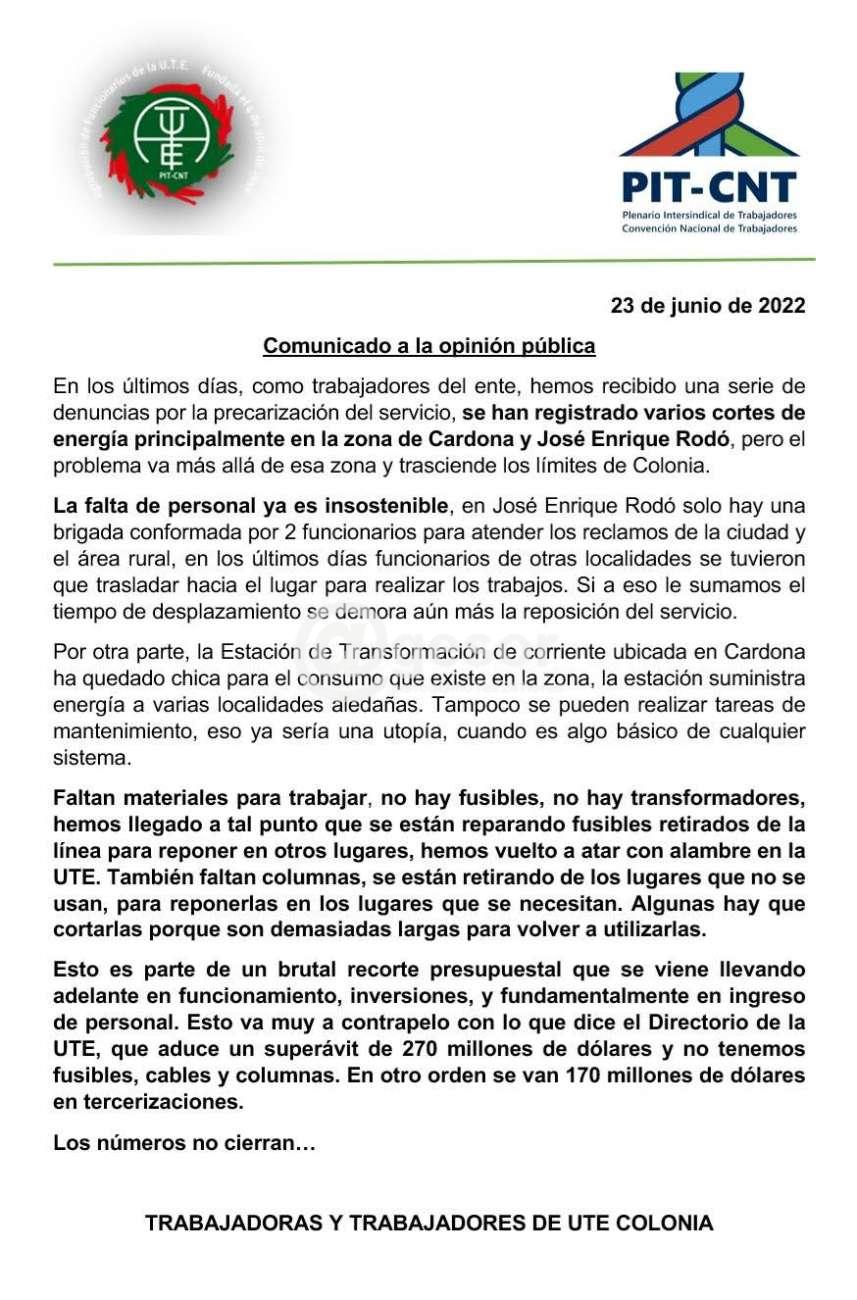 Trabajadores de UTE de Colonia califican como insostenible la falta de personal, ya que en José Enrique Rodó “una brigada conformada por 2 funcionarios para atender los reclamos de la ciudad y el área rural, en los últimos días funcionarios de otras localidades se tuvieron que trasladar hacia el lugar para realizar los trabajos”. Los cortes de energía eléctrica que afectaron a Cardona y José Enrique Rodó, también se extendió “más allá de esa zona y trasciende los límites de Colonia” expresan en un comunicado. Comentando que además “faltan materiales para trabajar, no hay fusibles, no hay transformadores, hemos llegado a tal punto que se están reparando fusibles retirados de la línea para reponer en otros lugares”.