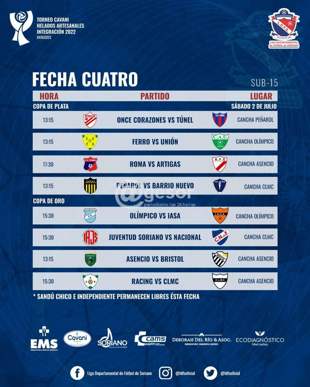 Definieron los partidos de la sub 15 del fútbol mercedarioLa Liga de Fútbol de Soriano se procedió a fijar los partidos de inferiores por la copa de Plata. En ese sentido jugarán a la hora 13 y 15 Once Corazones vs Túnel en cancha de Peñarol, mientras que Ferro vs Unión juegan en cancha de Olímpico a la hora 13 y 15. Roma enfrenta a Artigas a la hora 17 y 30 en cancha de Asencio, y Peñarol vs Barrio Nuevo juegan en cancha de CLMC a la hora 17.15