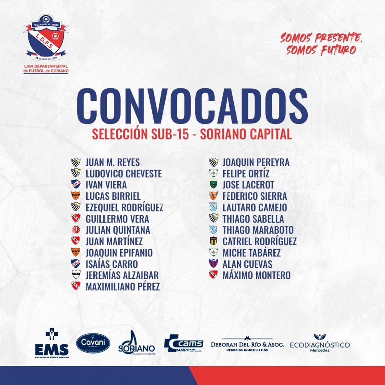 El técnico designado por el Consejo Directivo de la Liga Departamental de Fútbol de Soriano (Soriano Capital), Alejandro Pacilio, dio a conocer la nómina de jugadores convocados para la Selección Sub 15, ellos son: Juan M. Reyes, Ludovico Cheveste, Iván Viera, Lucas Birriel, Ezequiel Rodríguez, Guillermo Vera, Julián Quintana, Juan Martínez, Joaquín Epifanio, Isaías Carro, Jeremías Alzáibar, Maximiliano Pérez, Joaquín Pereyra, Felipe Ortiz, José Lacerot, Federico Sierra, Lautaro Camejo, Thiago Sabella, Thiago Maraboto, Catriel Rodríguez, Miche Tabárez, Alan Cuevas, Máximo Montero.