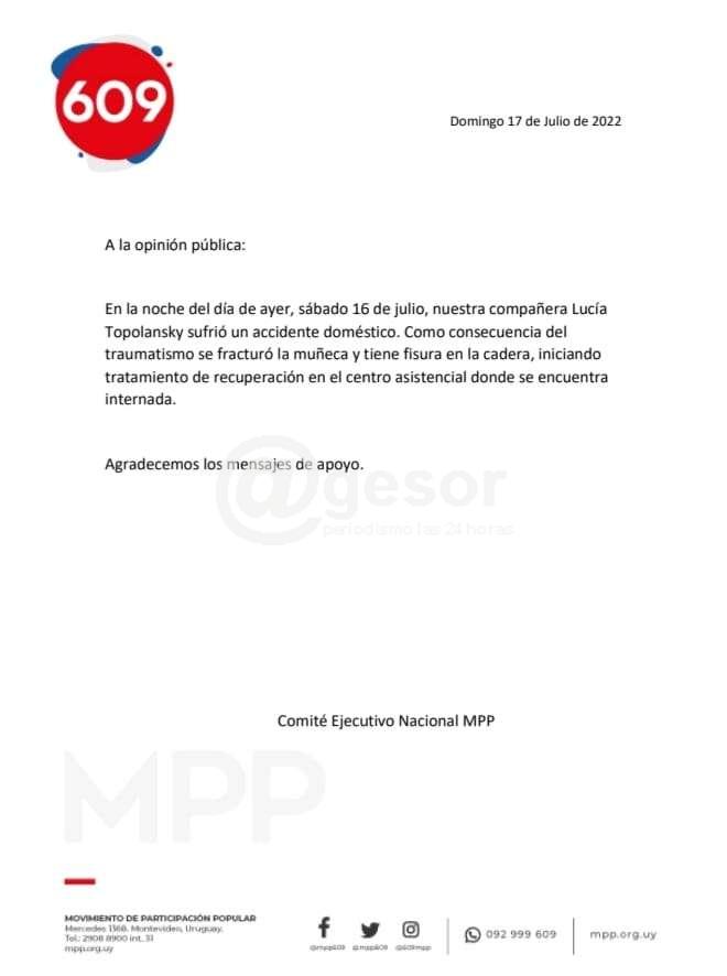 En la noche del día de ayer, sábado 16 de julio, nuestra compañera Lucía Topolansky sufrió un accidente doméstico. Como consecuencia del traumatismo se fracturó la muñeca y tiene fisura en la cadera, iniciando tratamiento de recuperación en el centro asistencial donde se encuentra internada.