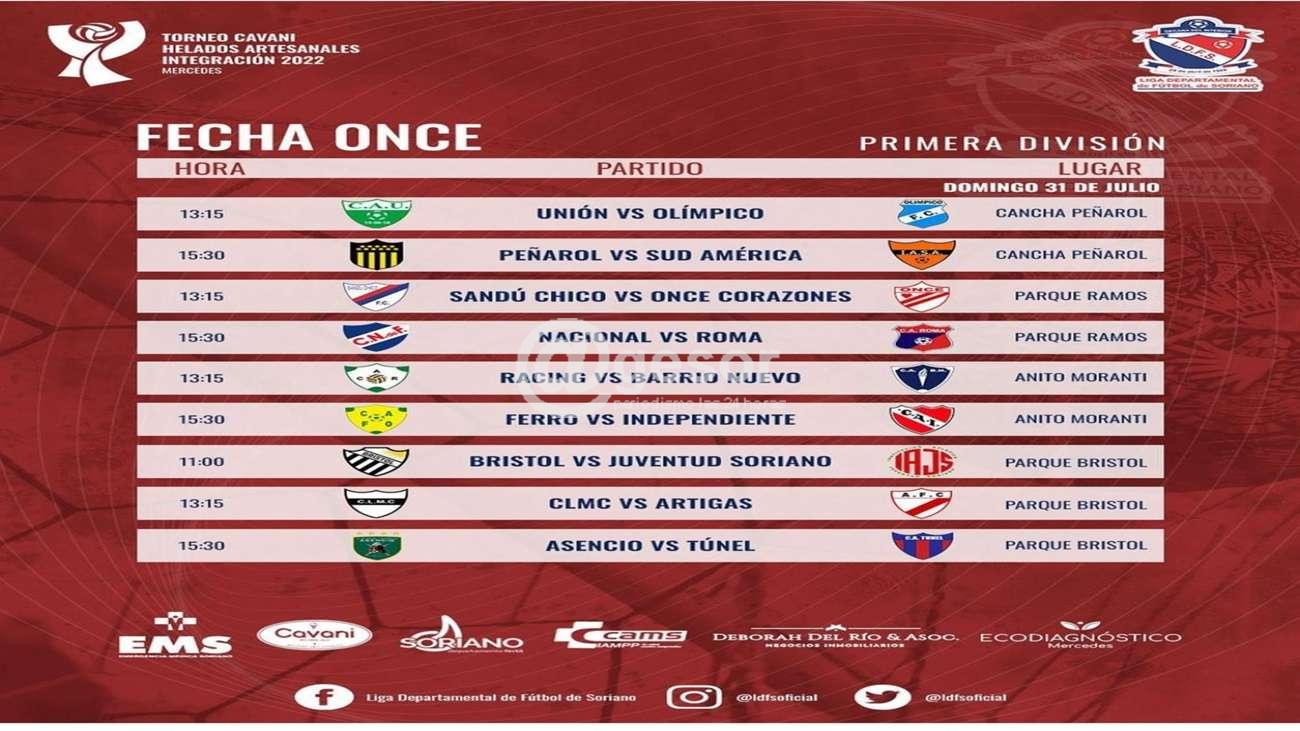 Posteriormente se fijó la fecha número 11 del Torneo con los siguientes partidos, hora 11 y para la TV juegan el partido de la fecha, Bristol vs Juventud Soriano en cancha de Bristol, en el mismo escenario juegan a la hora 13 y 15 CLMC vs Artigas, y a segunda hora Asencio vs Tunel. En cancha de Peñarol juegan a las 13 y 15 Olímpico vs Unión, y a las 15 y 30 Peñarol vs Sud América. En cancha de Nacional juegan hora 13 y 15 Sandú Chico vs Once Corazones y a las 15 y 30 Nacional vs Roma. Y en el Moranti, a primera hora juegan Racing vs Barrio Nuevo y 15 y 30 Ferro vs Independiente.