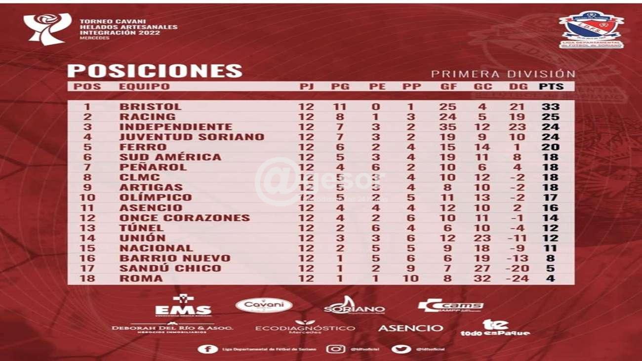 Culminada la  12va fecha, Bristol con  33 puntos  es el único líder.  A  8 puntos  le sigue Racing con  25.