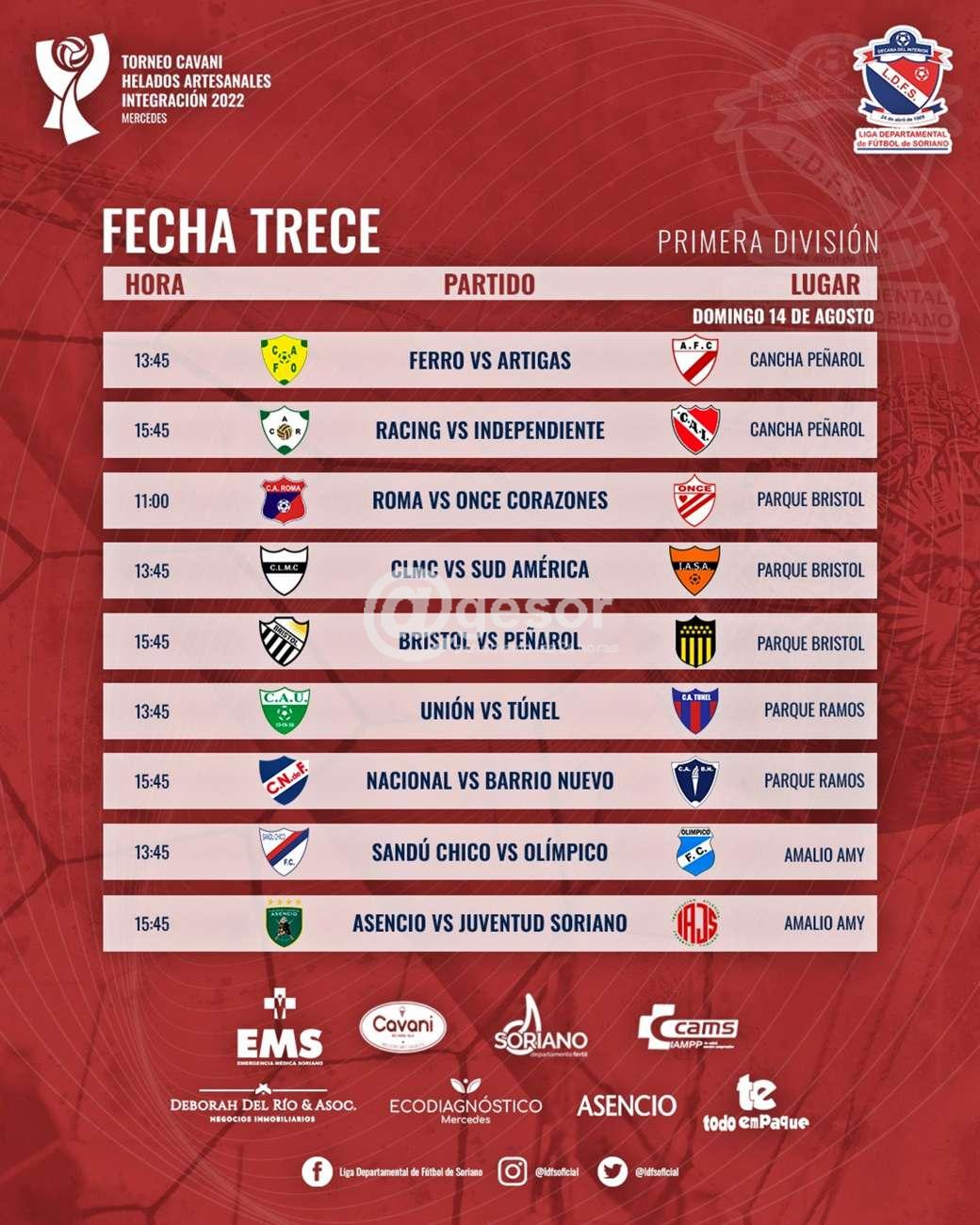 Reunido el Consejo Directivo de la Liga Departamental de Fútbol de Soriano bajo la presidencia del Dr. Pablo Marrero a los efectos de fijar la fecha trece del Torneo Integración del Fútbol Mercedario como también tratar temas varios.