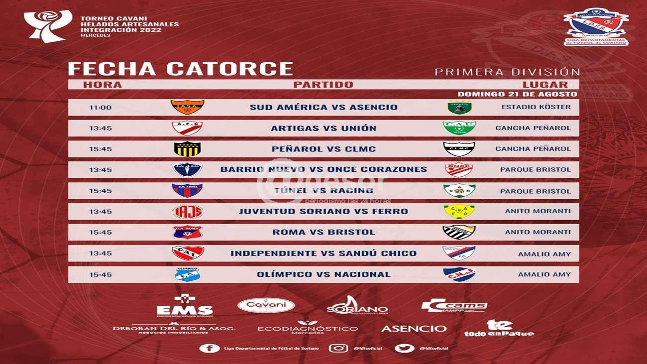 La Liga Departamental de Fútbol se Soriano fijó los partidos de la 14ta fecha del torneo de primera división. Todos los partidos se disputarán el domingo 21 de agosto, y para la TV juegan en cancha Sud América vs Asencio en el Koster hora 11, en cancha de Peñarol juegan a primera hora Artigas vs Unión y a segunda hora Peñarol vs CLMC.