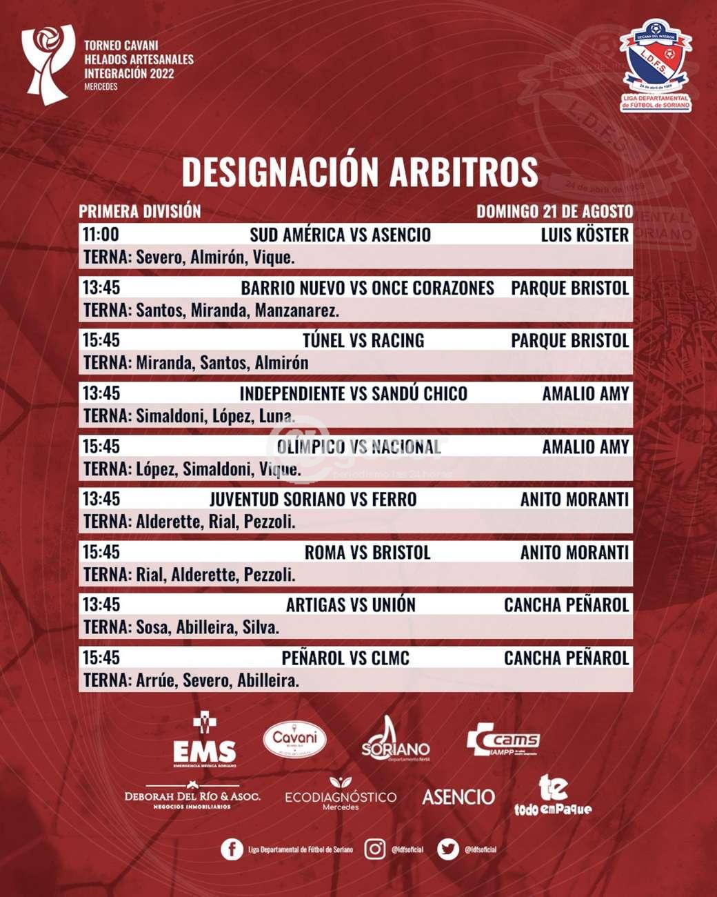 El Colegio de Arbitros de la Liga Departamental de Fútbol de Soriano dio a conocer los jueces para una nueva fecha del Clasificatorio del Competencia este fin de semana, destacándose que el líder Bristol que enfrenta a Roma tendrá como terna arbitral en el complejo "Anito Moranti" a Rial, Alderette y Pezzoli; el encuentro entre Racing vs. Túnel en parque Bristol será conducido por Miranda, Santos y Almirón. Mientras tanto el juego televisado del domingo a la mañana que disputarán Sud América vs. Asencio en el estadio "Luis Köster" será arbitrado Severo, Almirón y Vique.