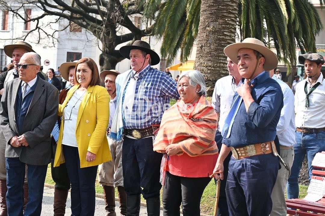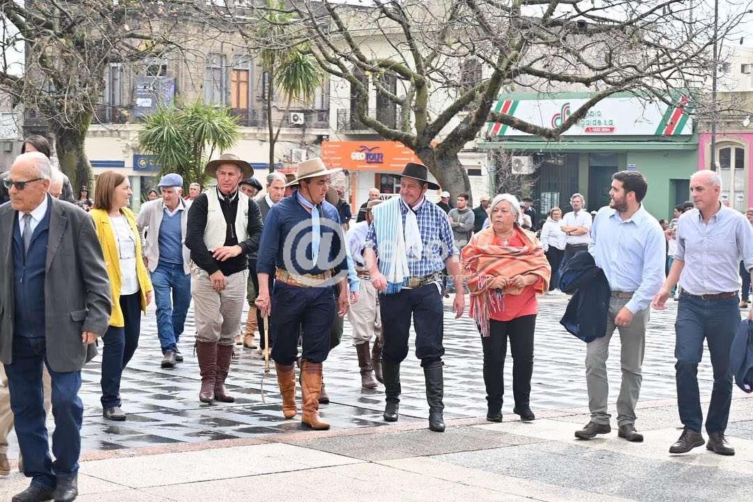 Una vez arribados los marcheros, se procedió a colocar la ofrenda floral, a presentar la placa conmemorativa de los 80 años del monumento al Gaucho de Asencio y a entonar estrofas de nuestro Himno Patrio, todo lo cual se realizó fuera de protocolo ya que la lluvia continuaba de manera intermitente.