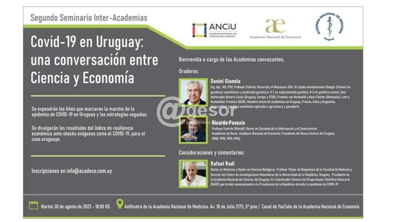 El próximo martes 30 de agosto, desde las 18 horas, las academias nacionales de Medicina, Ciencias y Economía organizan un nuevo seminario conjunto, esta vez dedicado a abordar, desde diversos ángulos, las consecuencias de la pandemia de COVID-19 en Uruguay.