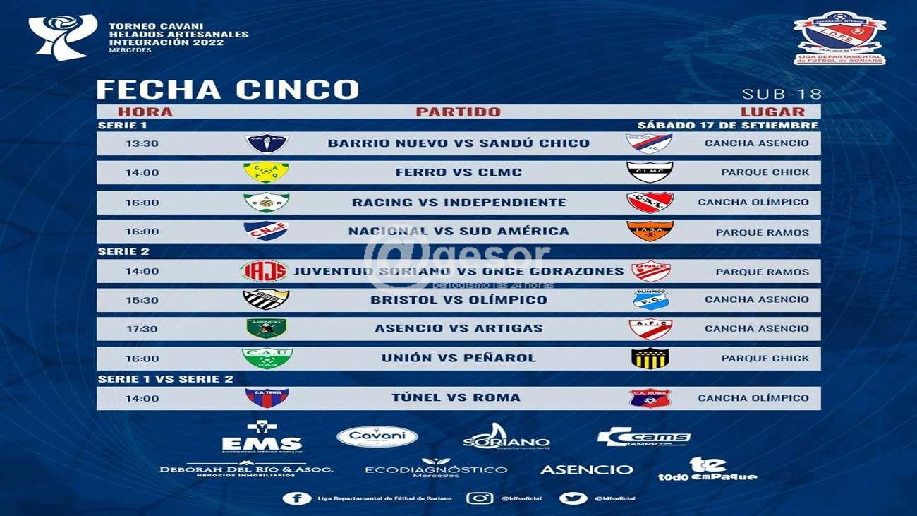 Se reunió la Liga Departamental de fútbol de Soriano bajo la presidencia del Dr. Pablo Marrero a los efectos de fijar la quinta fecha del Torneo sub 18 que determina que a la hora 13 y 30 jueguen Barrio Nuevo vs Sandú Chico, a la hora 15 y 30 Bristol vs Olímpico y a la hora 17 y 30 Asencio vs Artigas.