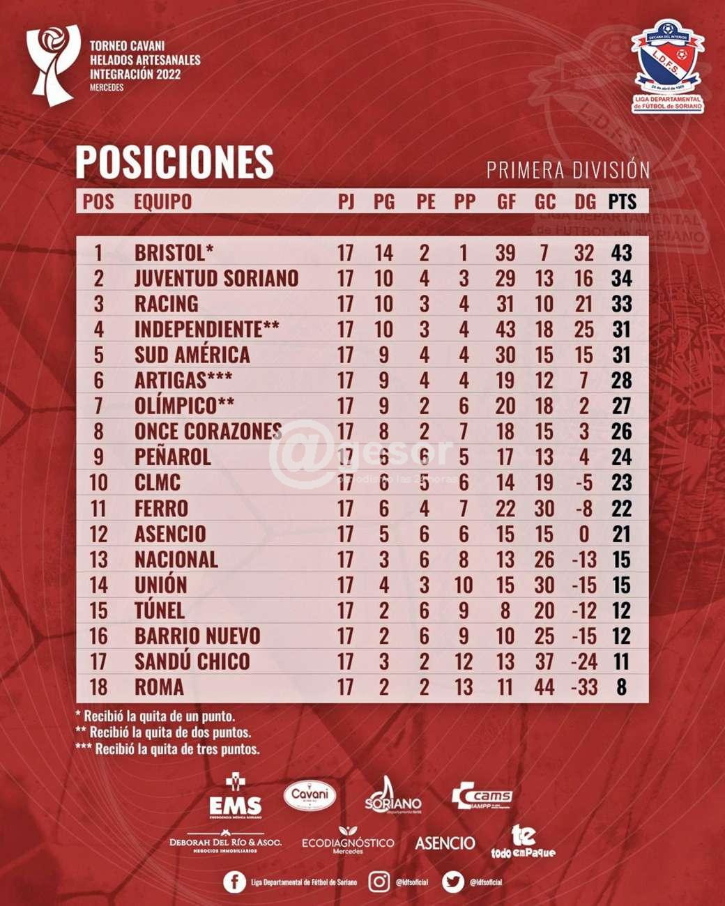 Ellos son Bristol, Juventud Soriano, Racing, Independiente, Sud América y Artigas.