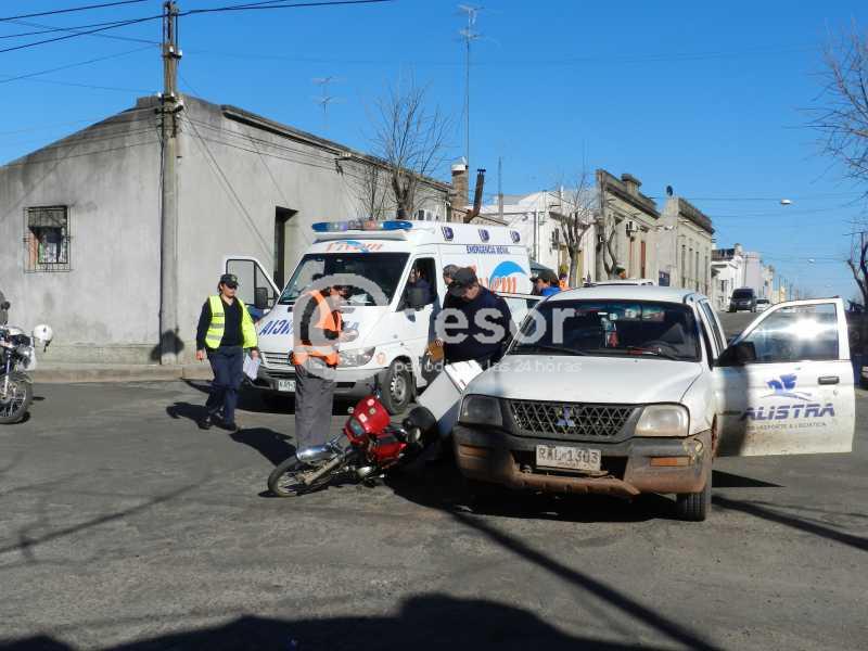 Minutos antes de las 11.00 horas de este martes se produjo colisión en la intersección de Oribe y Ansina, entre la moto Baccio 70 cc matrícula KMW 697 guiada por Juan Francisco Herrera trabajador del servicio delibery de carnicería, que circulaba por Oribe al Norte y la camioneta Mitsubishi RAL 1303 de la empresa Alistra conducida por Alejandro Crurbelo Moreno, que se dirigía por Ansina al Este.