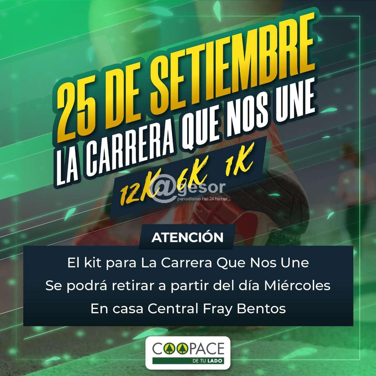 Desde COOPACE se informa que a partir de este miércoles se comienzan a entregar los kits para "La carrera que nos une" de atletismo del 25 de setiembre de 12 km, 6 km y 1 km, en Casa Central de Fray Bentos.