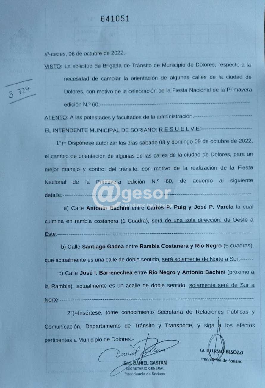 Mediante un Decreto el Intendente de Soriano, Guillermo Besozzi, autorizó el cambio de orientación del tránsito vehicular en algunas calles de Dolores. Se trata de una medida que se aplicará solamente el sábado 8 y domingo 9 de octubre mientras se celebre la edición Nº 60 de la Fiesta Nacional de la Primavera.