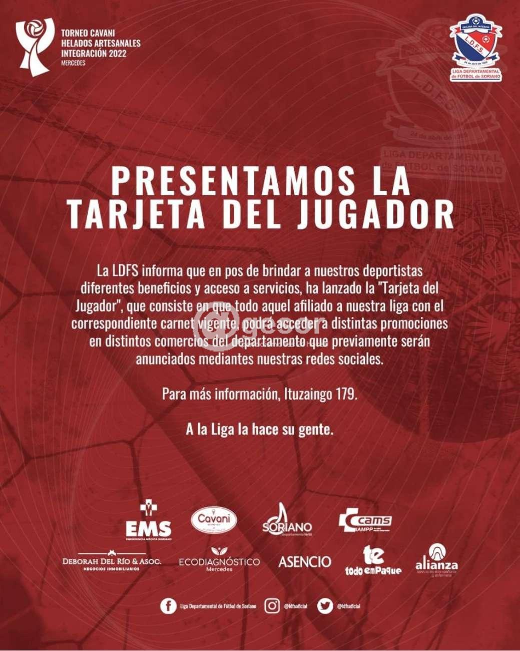 La Liga Departamental de Fútbol de Soriano lanzó la tarjeta del jugador. “La misma busca brindar beneficios a los jugadores afiliados a la Liga mediante la presentación del carnet del jugador en los diferentes comercios que van a adherirse”, se expresa en un comunicado. La tarjeta “es gratuita para el Jugador que sólo requiere tener el carné”. Los comercios adheridos brindarán descuentos en artículos y servicios varios . “De esa forma los protagonistas de nuestro fútbol podrán tener un beneficio directo con grandes descuentos”, culmina el comunicado.