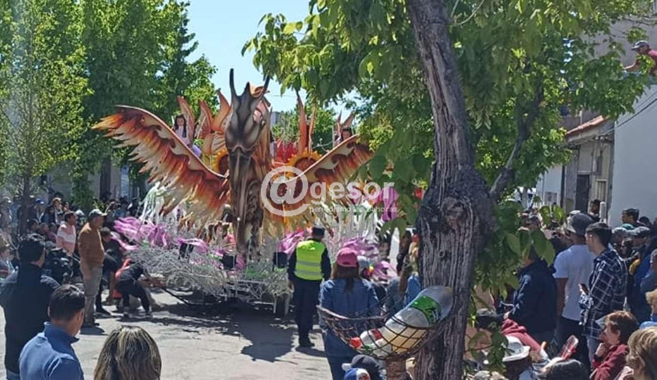 En la carroza se pueden apreciar girasoles cuyos centros han sido construidos con 160 tapitas por flor, sumando 2.800 en total. En esta carroza se han reciclado materiales como las ramas de espinillos.