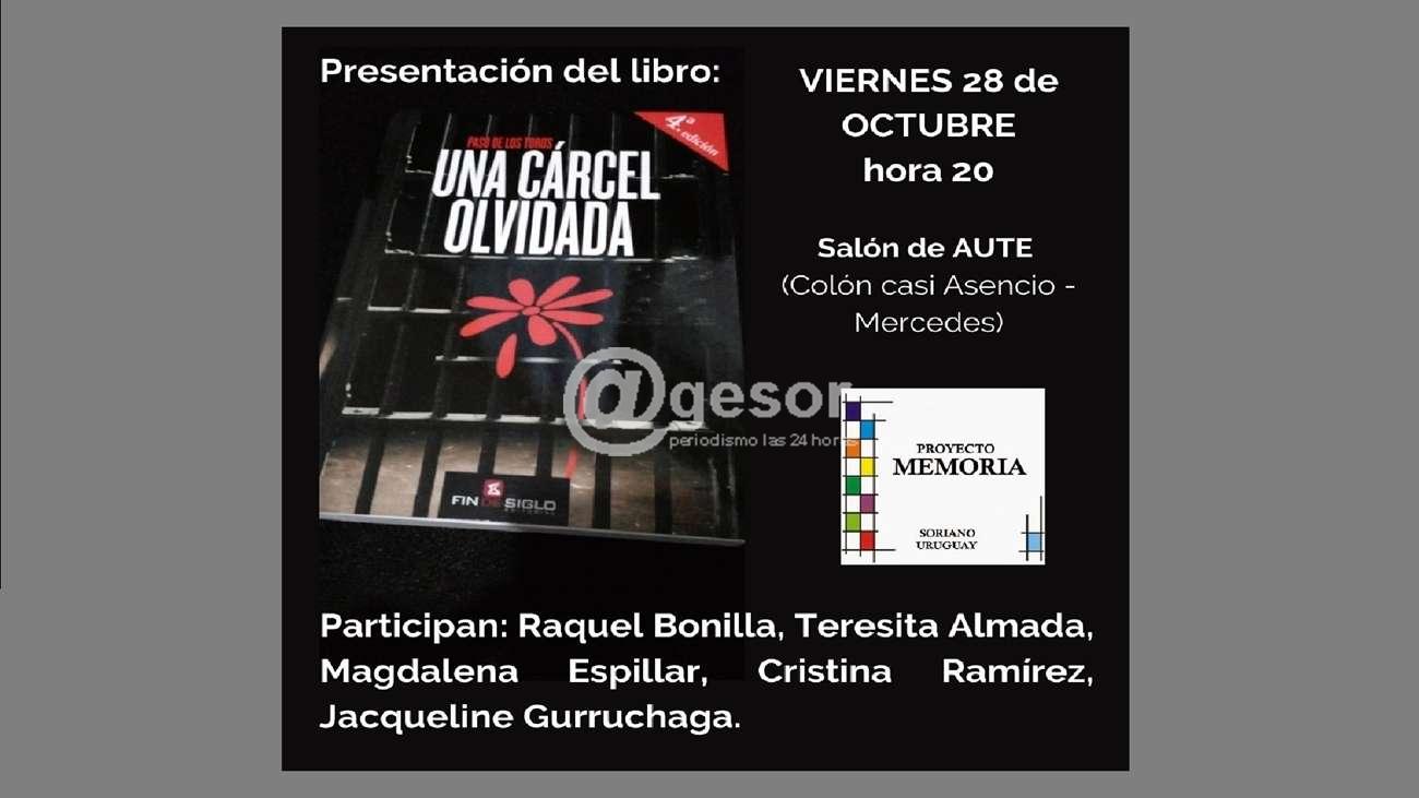 Este viernes se presenta el libro “Paso de los Toros, Una Cárcel olvidada”. Se trata de una actividad de la Comisión Memoria, Justicia y contra la Impunidad de Soriano. Participarán: Raquel Bonilla, Teresita Almada, Magdalena Espillar, Cristina Ramírez, y Jacqueline Gurruchaga.