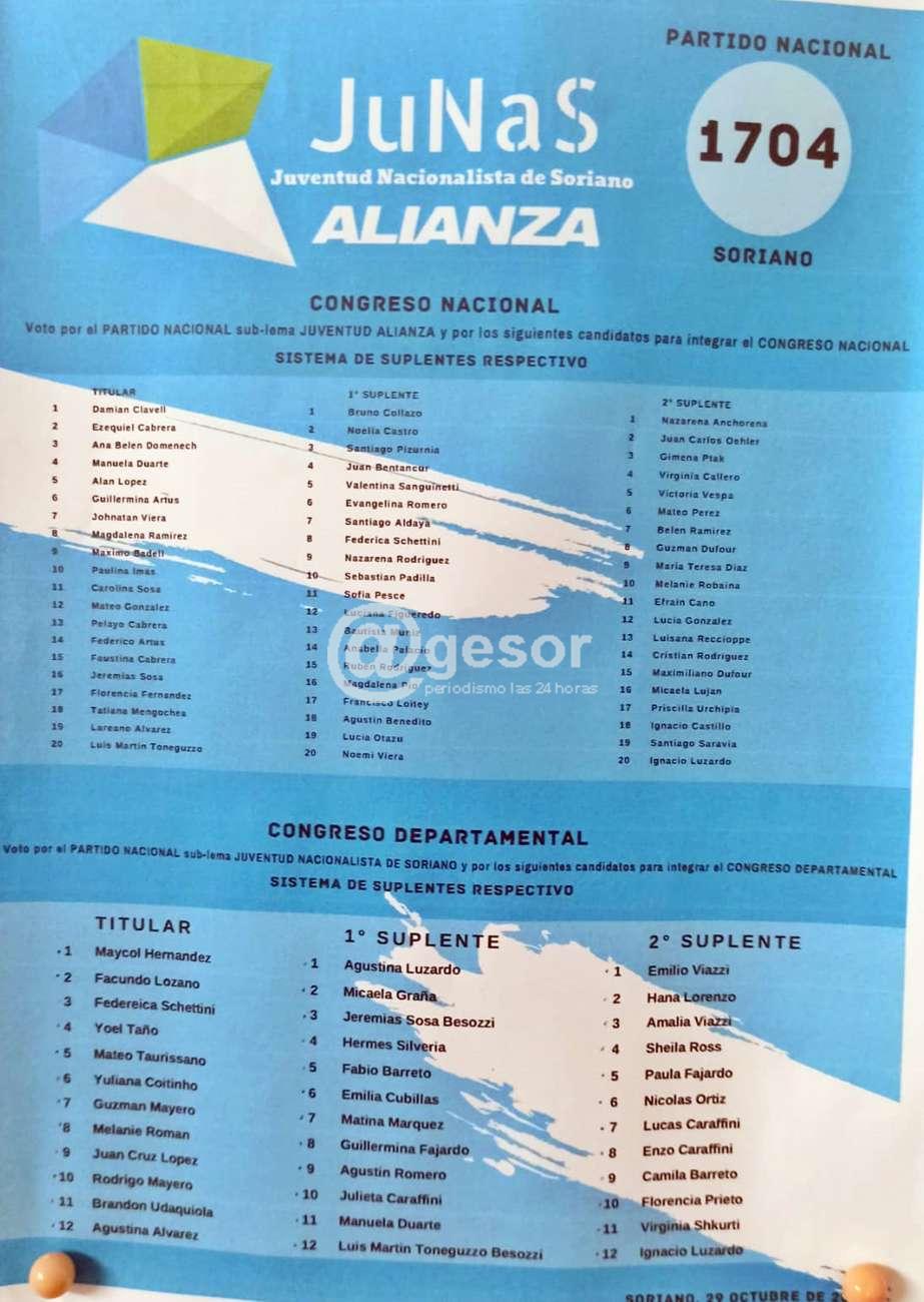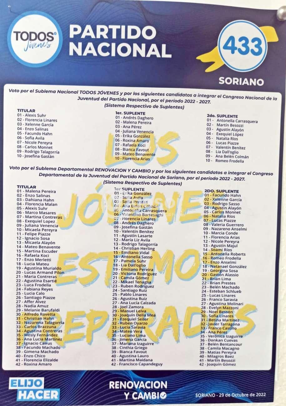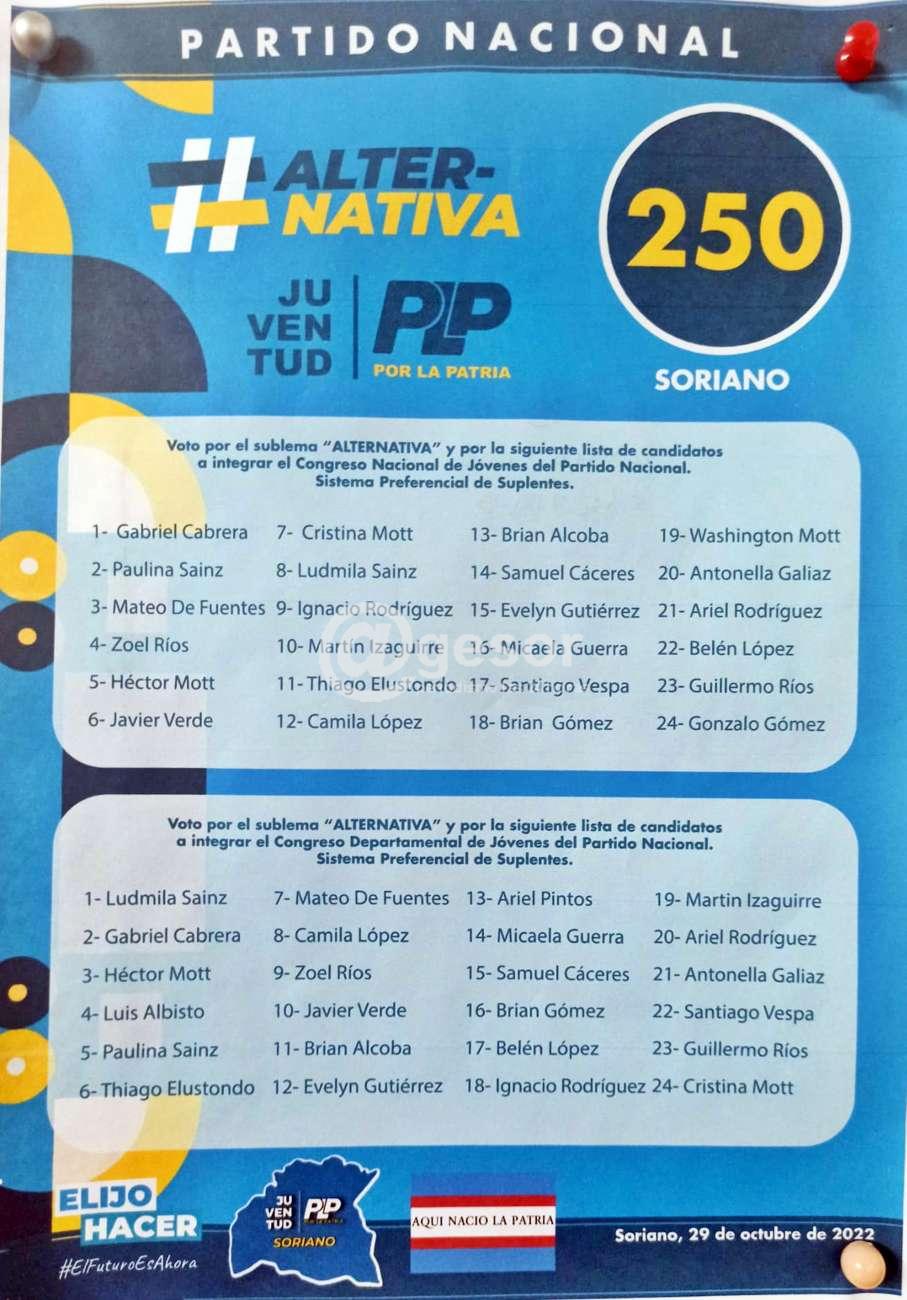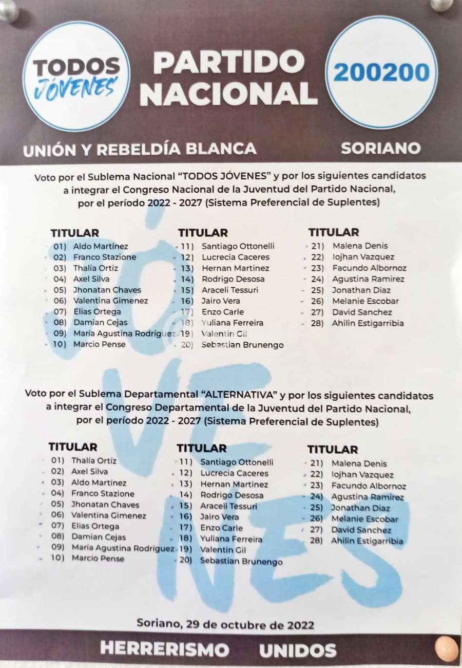 Nueve hojas de votación participan en Soriano de las Elecciones de Jóvenes del Partido Nacional este sábado 29 de octubre en el horario de 9.00 a 19.00