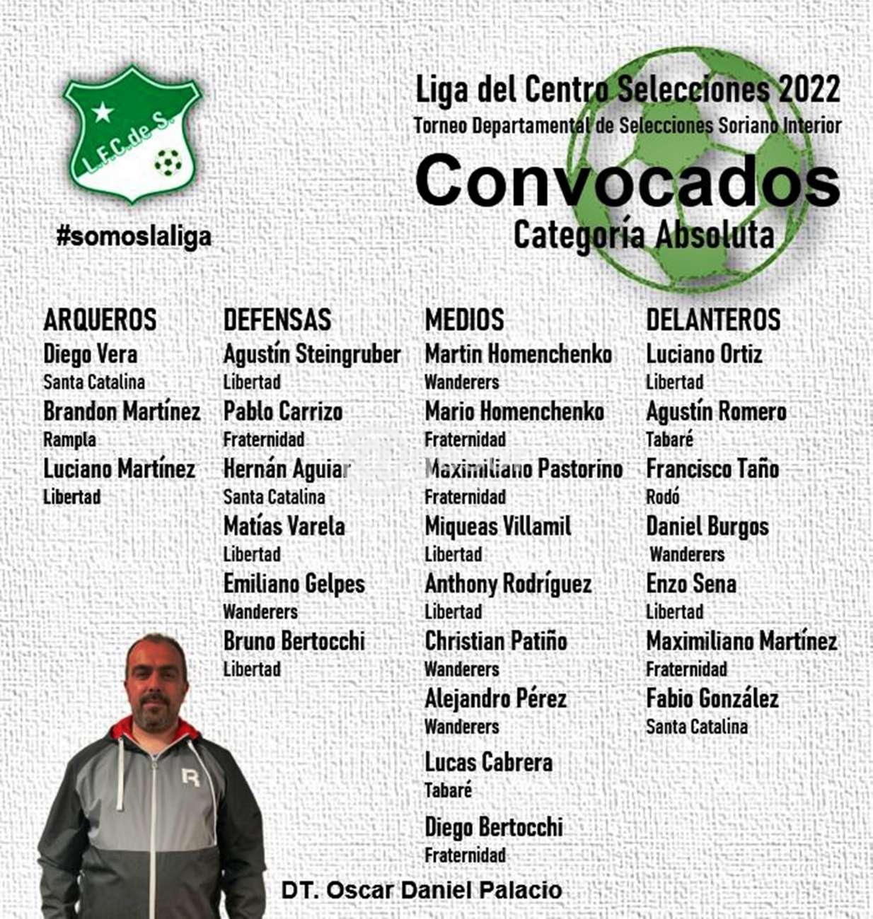 El Director Técnico Oscar Daniel Palacio dio a conocer el plantel de jugadores convocados en primera división para defender a la Selección de Liga del Centro de Soriano, en el Torneo Departamental de Selecciones de Soriano Interior.