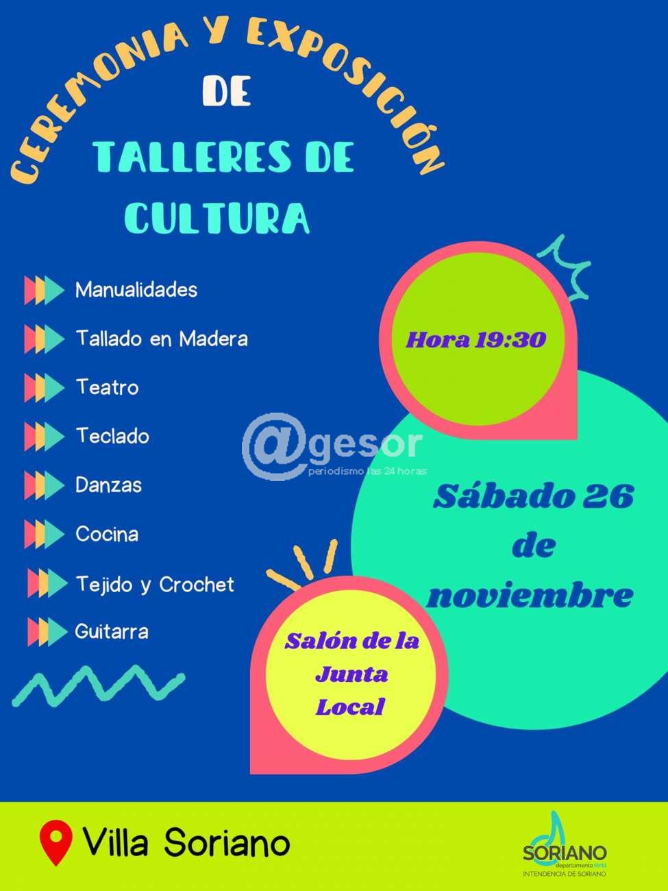 Este sábado 26 de noviembre a las 19.30 horas en el salón de la junta local de Villa Soriano, se lleva a cabo ceremonia y exposición de Talleres de Cultura.