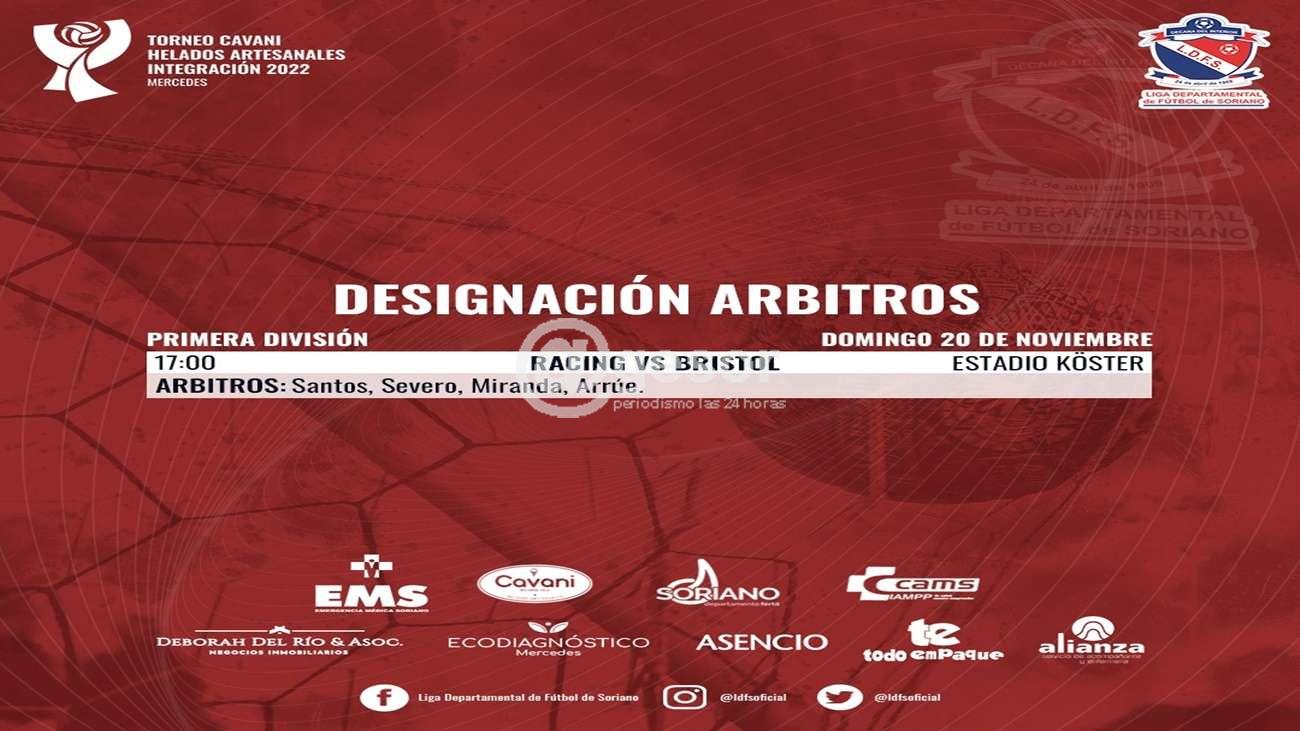 Santos, Severo, Miranda y Arrúe serán los árbitros del partido entre Racing y Bristol. El segundo partido de los tres pactados en la final del fútbol de primera división de Mercedes se jugará el domingo 20 de noviembre en el Estadio Luis Koster.