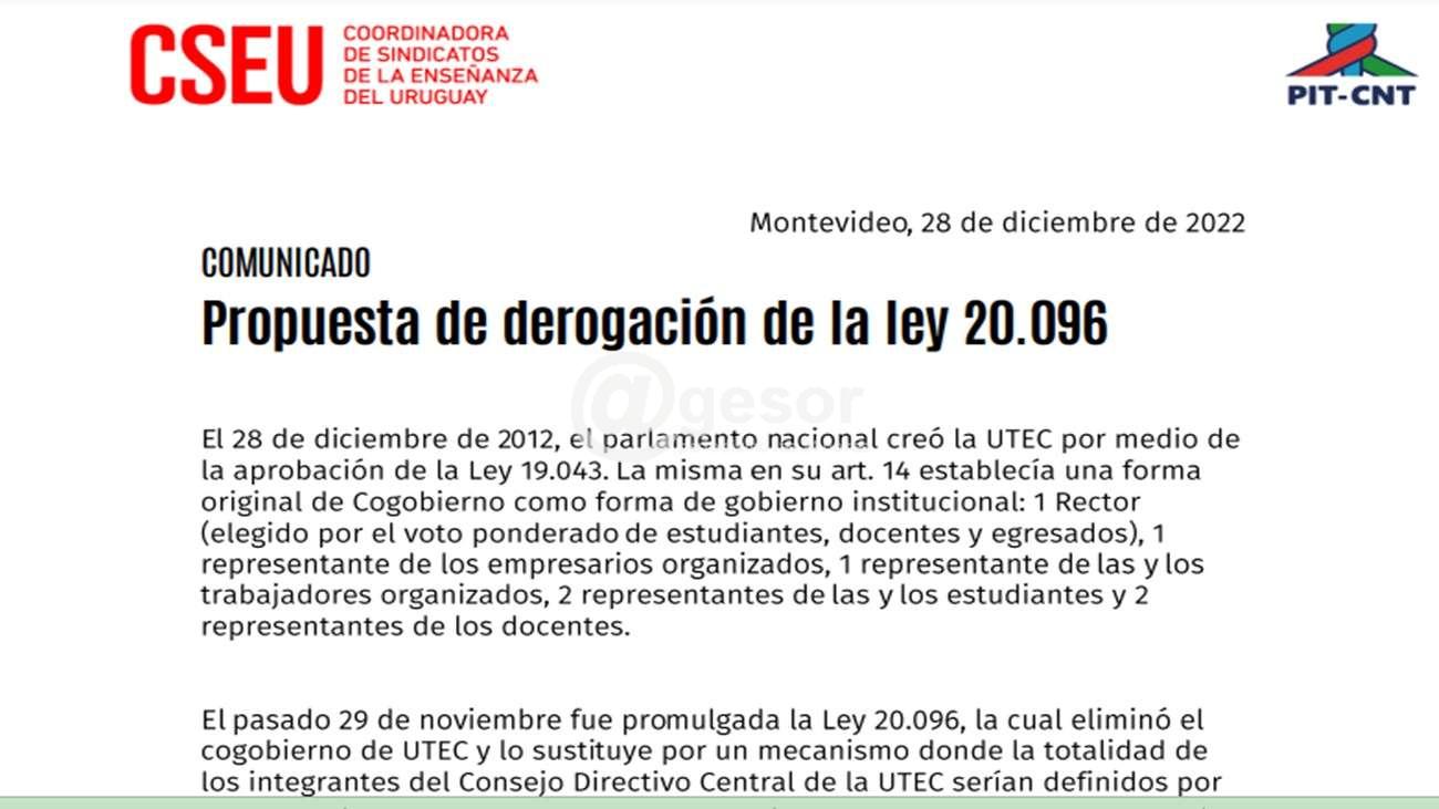 Derogar la Ley 20.096 e inmediatamente llamar a elecciones para la conformacion del Consejo Directivo Central de la UTEC de acuerdo al texto original de la ley 19.043.