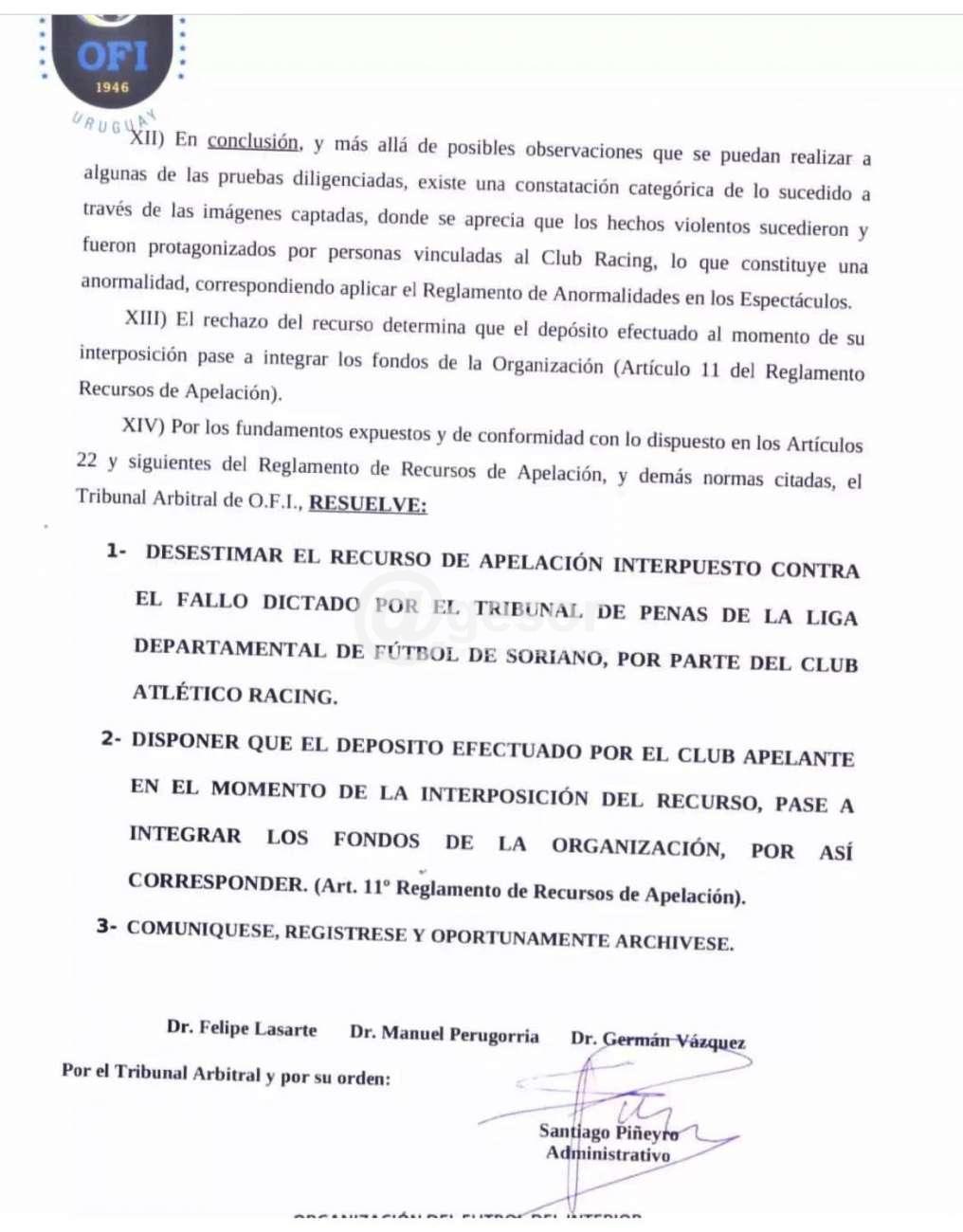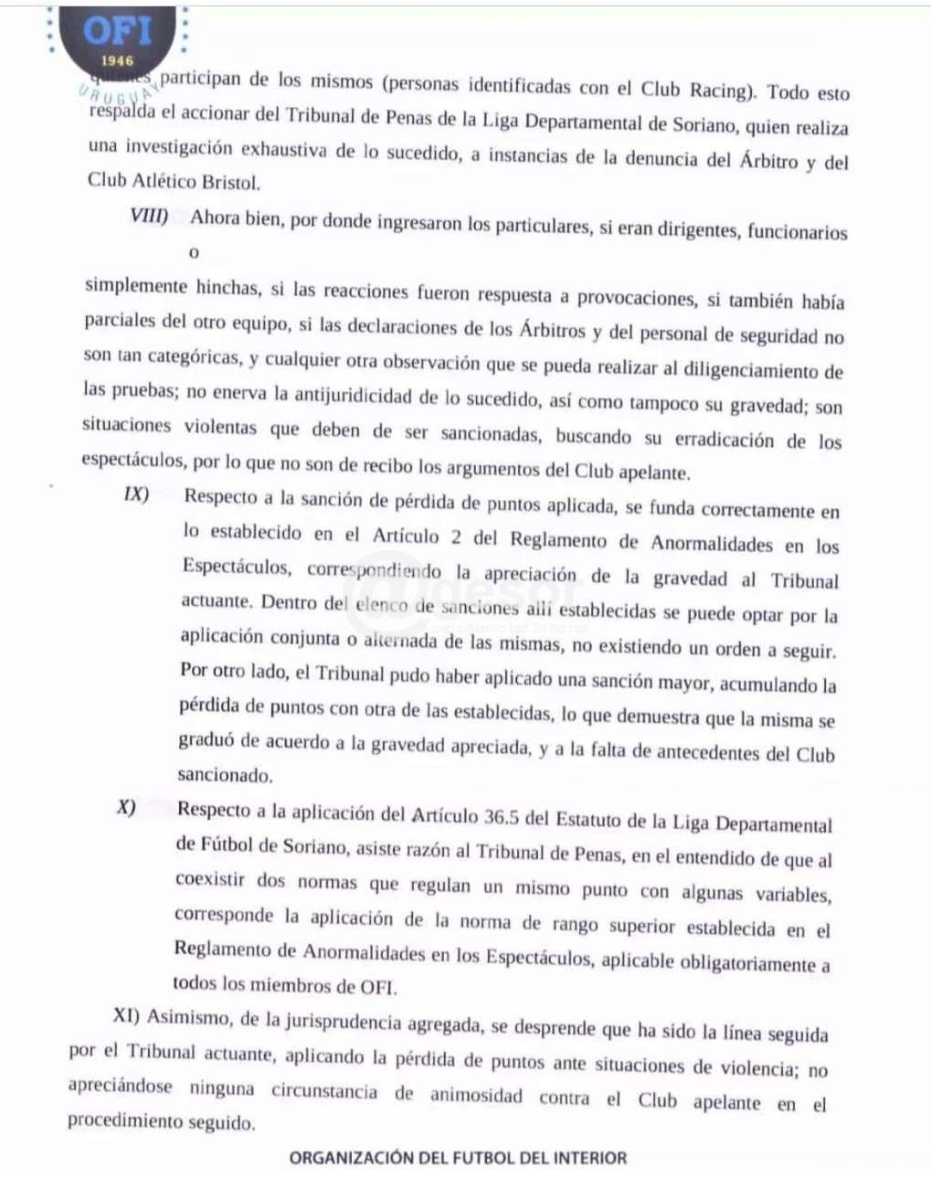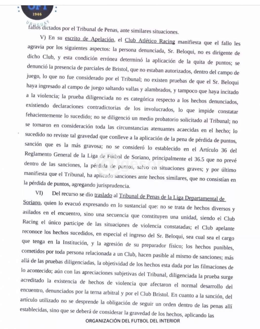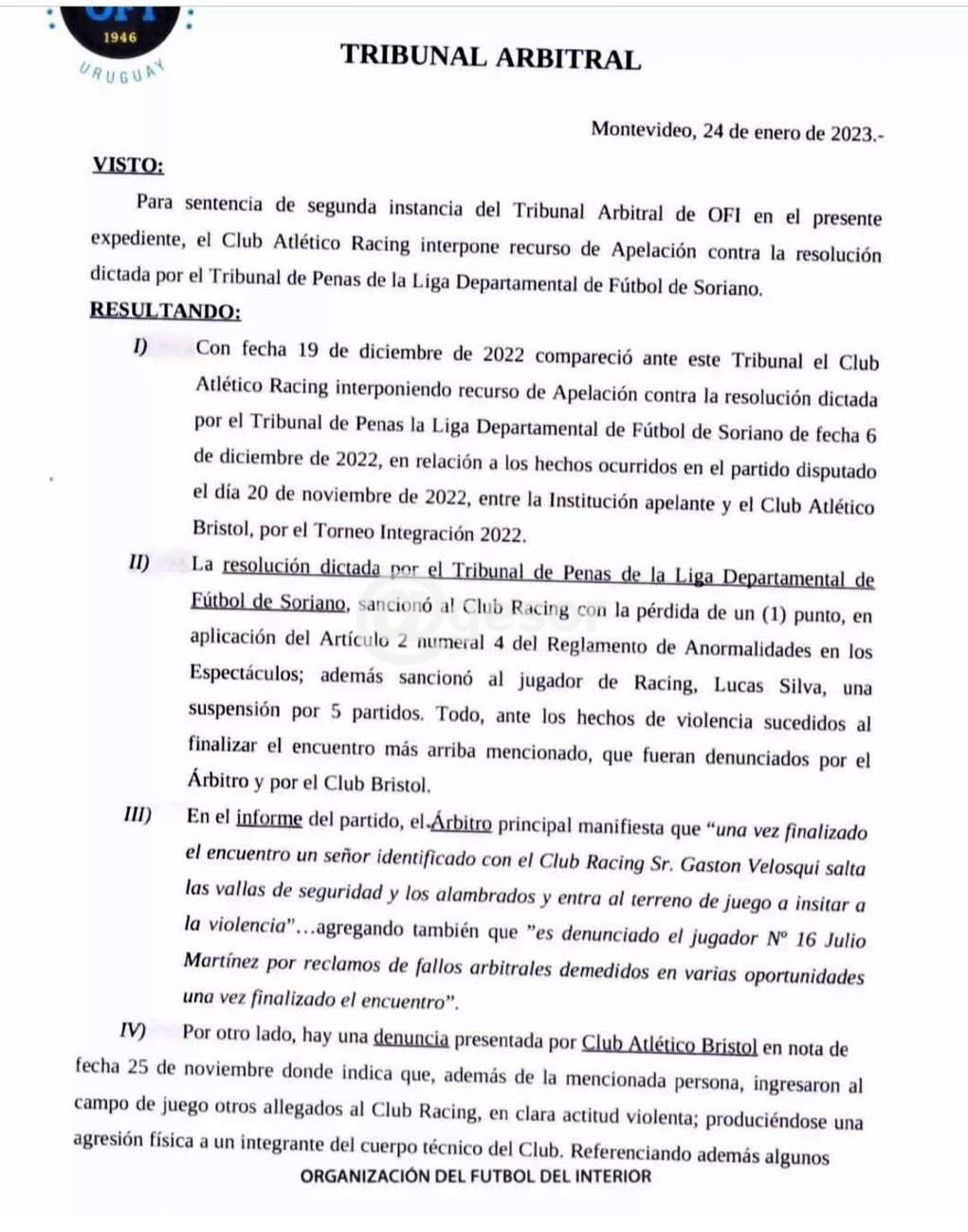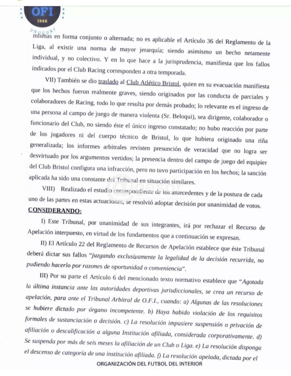 En las últimas horas el Tribunal Arbitral de OFI hizo llegar el fallo respecto de la apelación presentada por el Club A. Racing contra el fallo del Tribunal de Penas de la Liga Departamental de Fútbol de Soriano por el cual se le quitó un punto tras incidentes en el segundo encuentro final entre Bristol y Racing, que no permitió disputar el tercer encuentro ya que con esa resolución se proclamó Campeón a Bristol pues no podía alcanzar aun ganando Racing a los bohemios. Ese fallo fue recurrido por Racing y adjunto a esta nota ofrecemos el fallo completo del Tribunal Arbitral de OFI que ratifica el fallo del Tribunal de Penas de la LDFS.