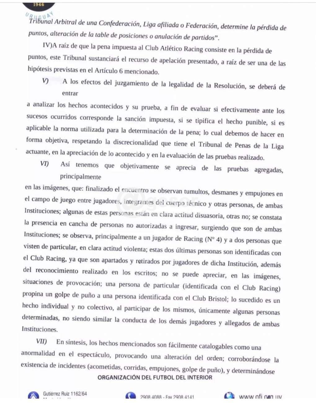 En la parte final expresa: "En conclusión y más allá de posibles observaciones que se puedan realizar a algunas de las pruebas diligenciadas, existe una constatación categórica de lo sucedido a través de las imágenes captadas, donde se aprecia que los hechos violentos sucedieron y fueron protagonizados por personas vinculadas al Club Racing , lo que constituye una anormalidad correspondiendo aplicar el Reglamento de Anormalidades en los Espectáculos.