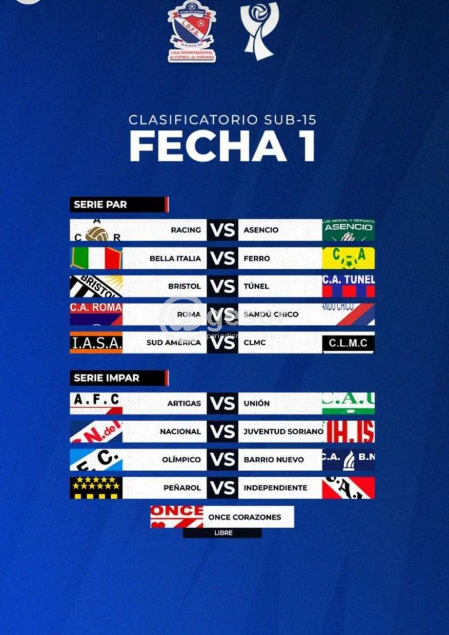 Se reunión el Consejo Directivo de la Liga Departamental de Fútbol de Soriano presidido por el Dr. Pablo Marrero en la cual se trataron varios temas vinculados al inicio del Torneo de fútbol de la categoría sub 15. El mismo se determinó que comienza el sábado 18 de marzo fijando la primera fecha del mismo que tras el sorteo determinó que sean los siguientes cruces, Racing vs Asencio, mientras que el debutante Bella Italia frente a Ferrocarril, Bristol vs Túnel, Roma vs Sandú y Sud América vs CLMC, estos partidos son parte de la serie 1 , mientras que en la serie 2 se enfrentarán Artigas vs Unión, Nacional vs Juventud, Olímpico vs Barrio Nuevo, Peñarol vs Independiente y Once Corazones queda libre.