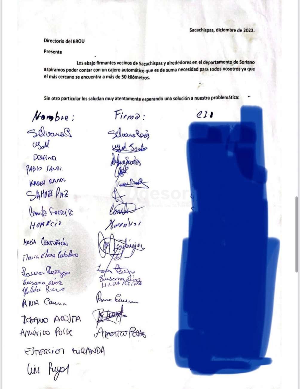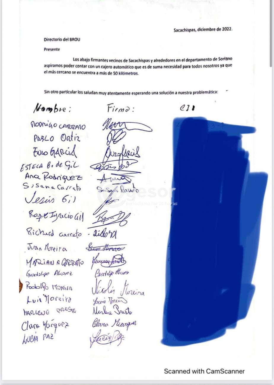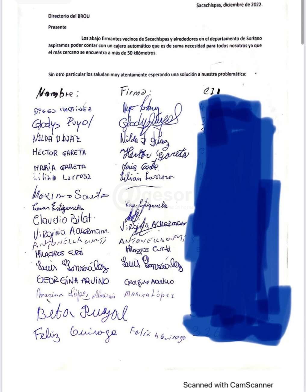 El Edil Luciano Andriolo señaló: "Elevamos a Presidencia del BROU 150 firmas de vecinos de Sacachispas solicitando la instalación de un cajero automático ya que el más cercano está a 50 km.