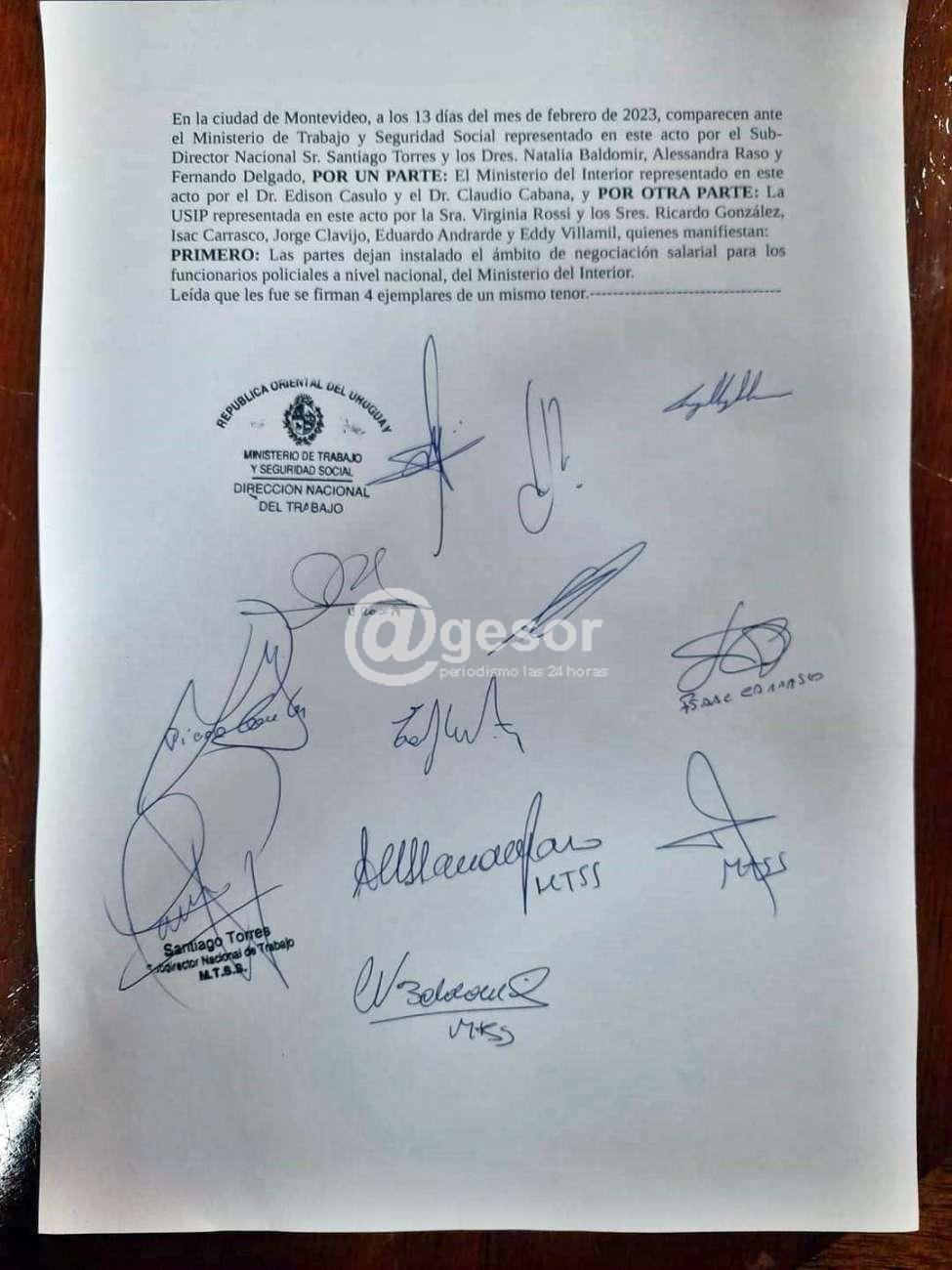 La USIP (Unión de Sindicatos Policiales) comunicó a @gesor que este lunes "se concurrió al MTSS manteniéndose una instancia tripartita entre el Ministerio del Interior (representado por los Dres. Edison Csulo y Claudio Cabana), Ministerio de Trabajo y Seguridad Social (representado por el Subdirector Nacional Dr. Santiago Torres y los Dres. Natalia Baldomir, Alessandra Raso y Fernando Delgado) y la USIP (como gremio representativo dentro del sector policial) representada por Ricardo González y Eduardo Andrade (Sifpom), Virginia Rossi (Afumi), Eddy Villamil (Aspoca y Sipolf), Issac Carrasco y Jorge Clavijo (Supu), lográndose en forma histórica, firmar bajo acta, la instalación del ámbito de negociación salarial permanente y exclusivo para los funcionarios policiales a nivel nacional del Ministerio del Interior.