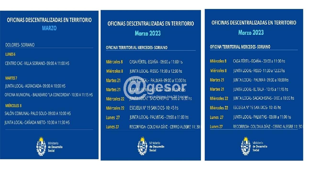 El Ministerio de Desarrollo Social, Soriano, informó el calendario de atención que cumplirán las Oficinas descentralizadas durante el mes de marzo.