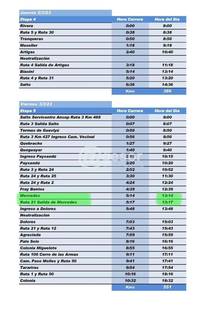 En este nota ofrecemos el recorrido por Mercedes, cuando ingrese la caravana que pasará por la capital sorianense y recibirán los coches los controles por los Rotary Mercedes y Mercedes Oeste, frente al Banco República en Colón y De Castro y Careaga a partir de las 13.14 horas, y posteriormente continuarán los vehículos rumbo a Colonia punto de llegada, pasando previamente por Dolores a las 13.47 horas.