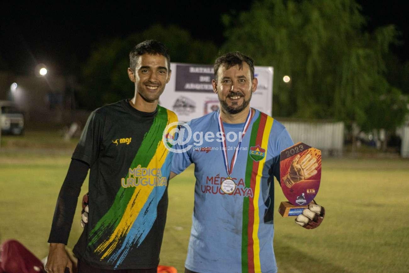 Enzo Arballo y Martín Aranguren con guantes, Mateo Machado con pantalón de arquero.