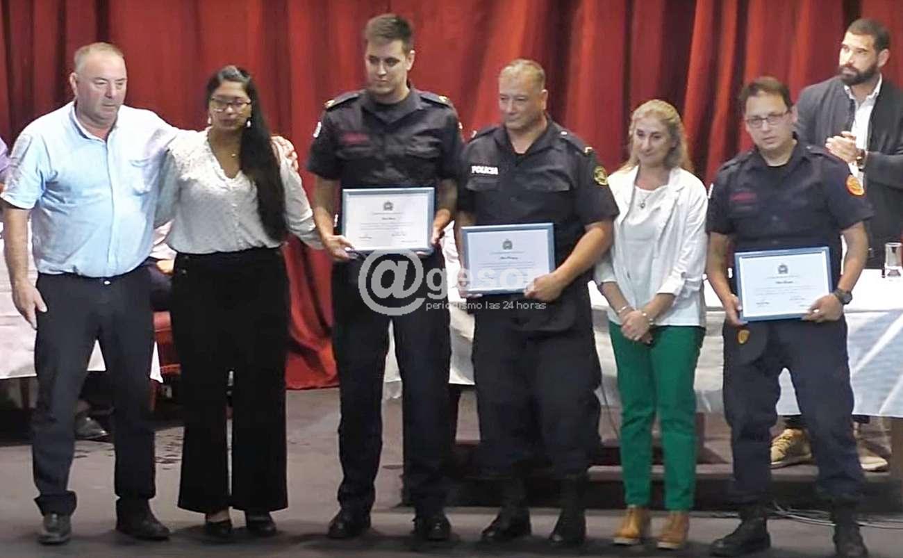 Los homenajes comenzaron con la entrega de diplomas a Alexis Rodríguez, funcionario policial que se desempeña en policlínica de Jefatura y también en EMS SVA y los funcionarios bomberos Hubert González y Jorge Sierra, quienes, como es de conocimiento público, en el cumplimiento de su labor de servicio y ante un hecho de extrema gravedad, protagonizaron, cada uno en su órbita de acción, actos heroicos poniendo en riesgo su propia vida.