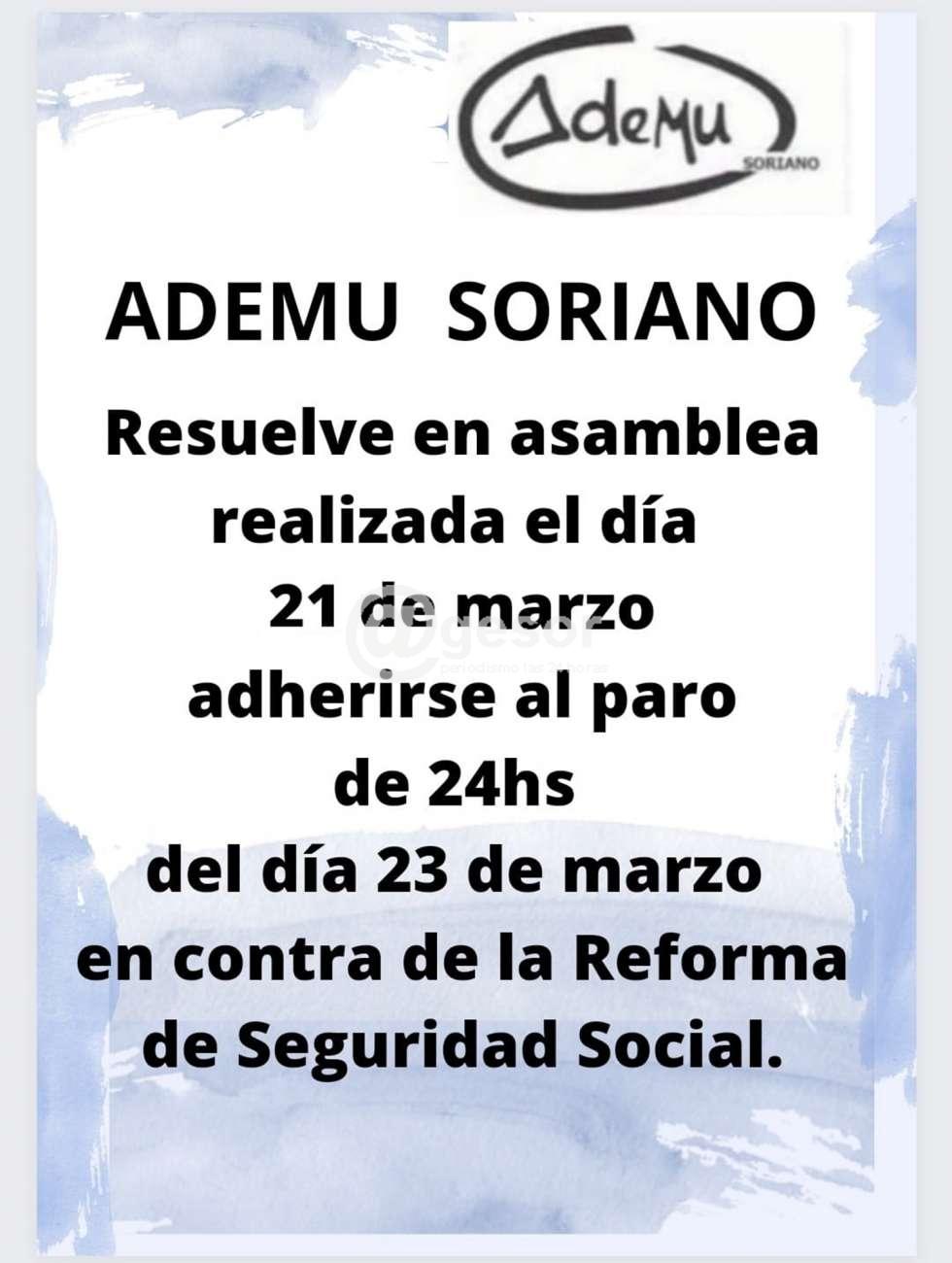 ADEMU  Soriano resolvió plegarse al paro convocado para este  23 de marzo por el PIT CNT.