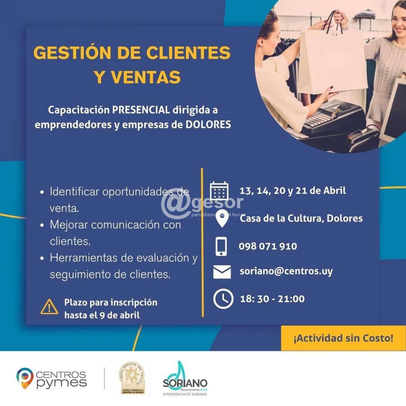 El Centro Pymes con el apoyo del Centro Comercial e Industrial de Soriano y la Intendencia de Soriano, junto al Municipio de Dolores están convocando a la capacitación presencial dirigida a emprendedores y empresas de Dolores a desarrollarse durante los días 13, 14, 20 y 21 de abril en Casa de la Cultura doloreña de 18.30 a 21.00 horas, siendo los temas a abordar: