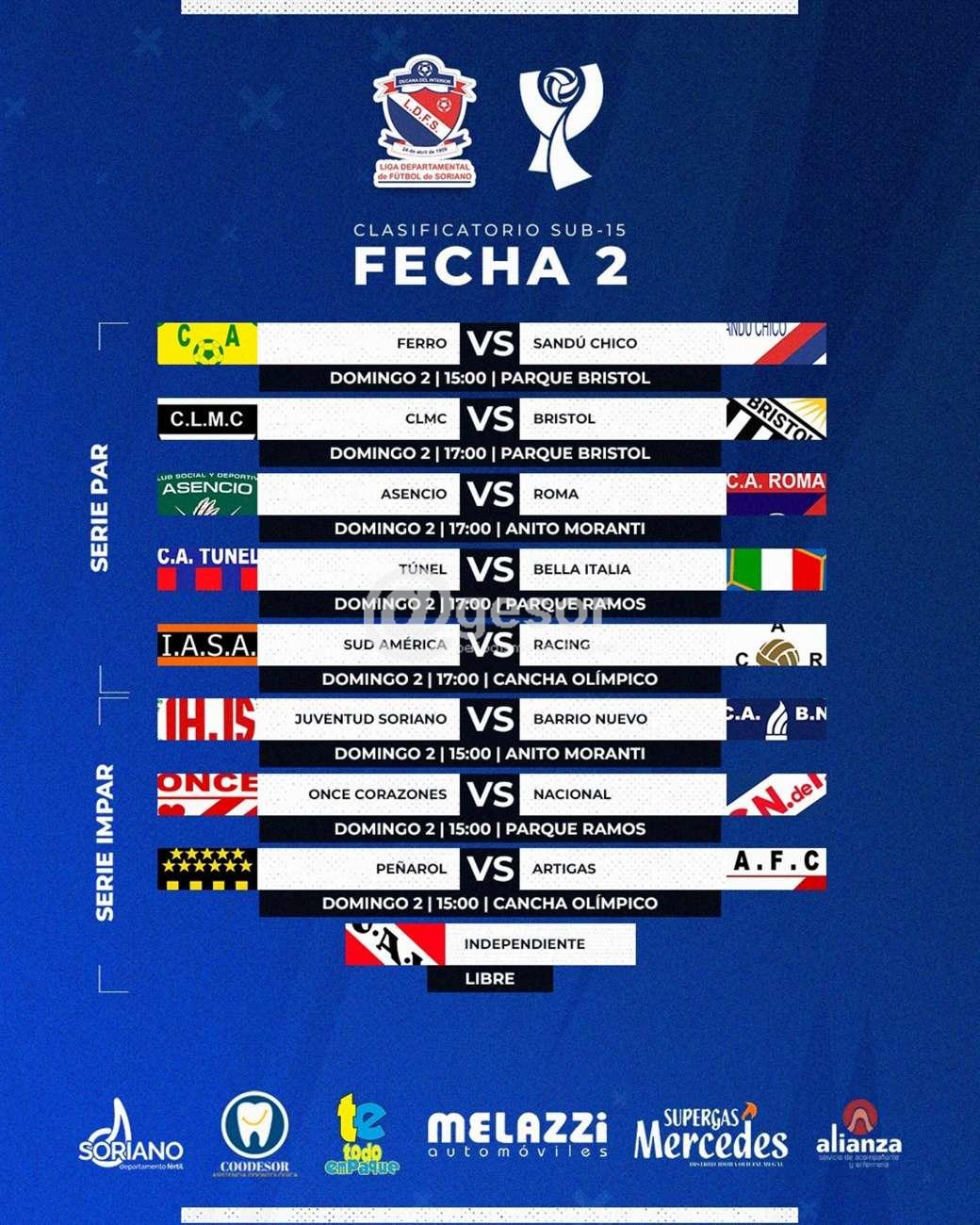 Se fijaron detalles de la segunda fecha del Clasificatorio de Sub 15 de la Liga Departamental de Fútbol de Soriano, así como las ternas designadas por el Colegio de Arbitros para esta segunda jornada del torneo, detalles que pueden encontrarse en las fotografías adjuntas.