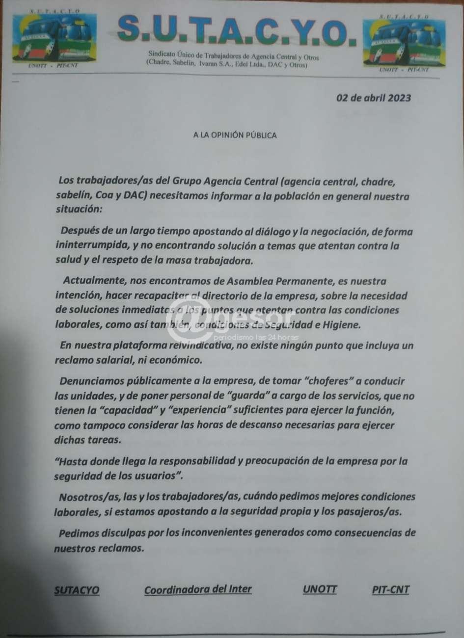 Los trabaja dores/as del Grupo Agencia Central (Agencia Central, Chadre, Sabelín, Coa y DAC} necesitamos Informar a la población en general nuestra situación:
