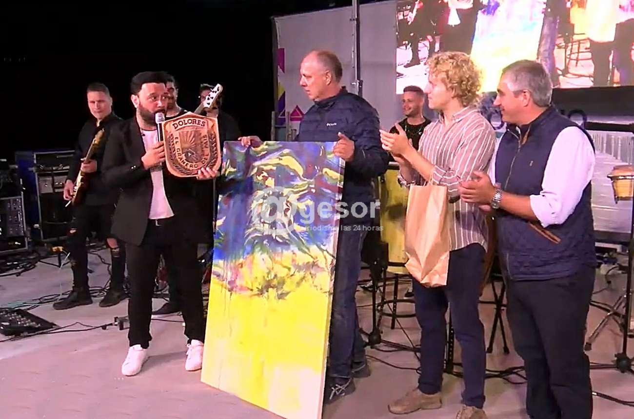 Se hicieron presente en el escenario el Alcalde de Dolores, Joaquín Gómez, que entregó un escudo de la ciudad; el Prosecretario de la Intendencia de Soriano, Gonzalo Castillo; y en nombre de la Asociación Civil Reconstruyamos Dolores, Aldo Charbonnier (también suplente del Diputado Martín Melazzi), quien entregó un cuadro pintado sobre bastidor de lienzo, titulada "Una noche en el viñedo", fue seleccionada por el Jurado internacional de Colonia en el 2022 entre 750 obras presentadas, ésta quedó entre las 50 mejores y fue expuesta en la Tercera Bienal de Arte, obra creada por el artista doloreño Adrián Meyer.