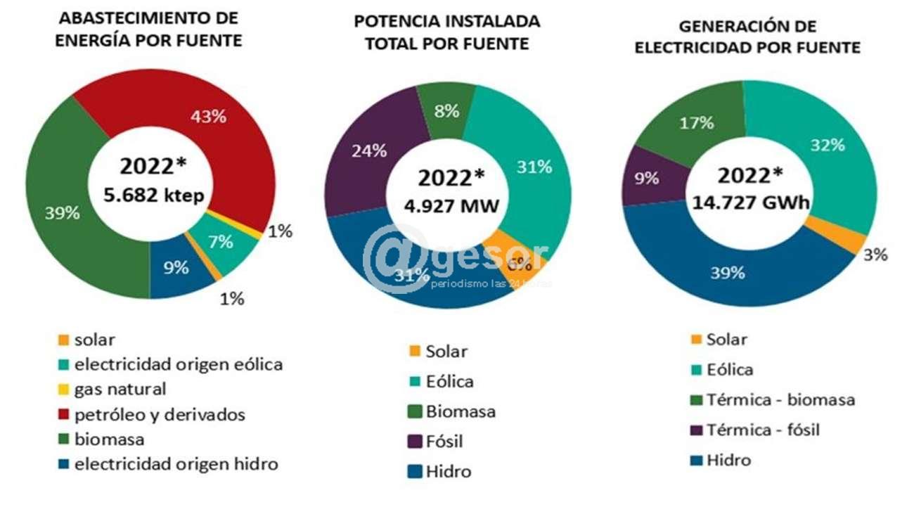 Por su parte, la energía eléctrica generada con combustibles fósiles y a partir de energía solar tuvieron participaciones de 9% y 3%, respectivamente. Estas características resultaron que en 2022 la matriz de generación eléctrica tuviera un 91% de fuentes de origen renovable. Se destaca la reducción en la participación de electricidad de origen fósil, dado que en 2021 su participación fue de 15%, lo que se explica en parte por las exportaciones efectuadas a Brasil en ese año.