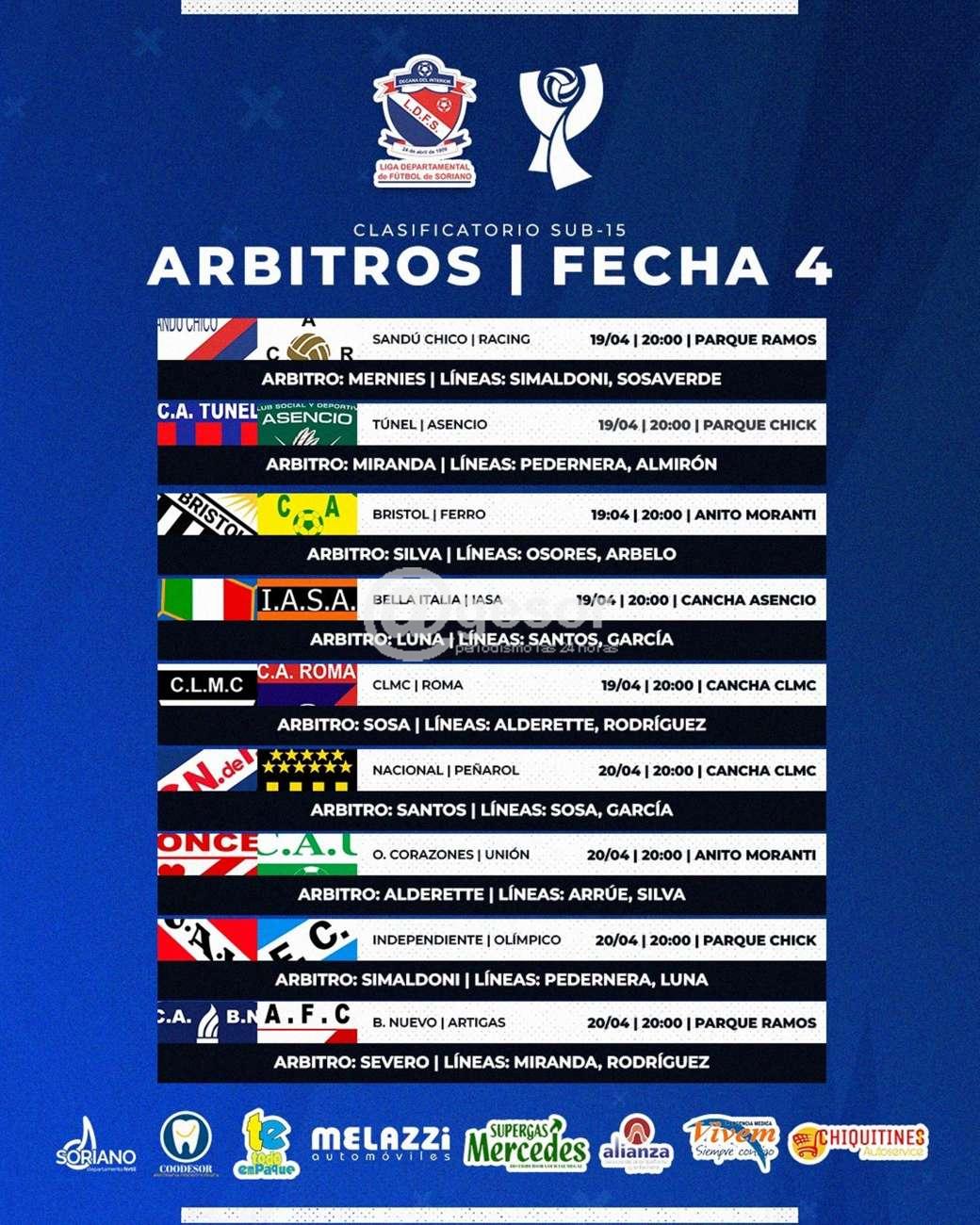 El Colegio de Arbitros de la Liga Departamental de Fútbol de Soriano realizó las designaciones de las ternas arbitrales que estarán al frente de los encuentros que se disputarán por la 4ª fecha del Clasificatorio de la categoría Sub 15, a jugarse durante este miércoles 19 y jueves 20 de acuerdo a los detalles que se adjuntan en la fotografía que acompaña esta nota.