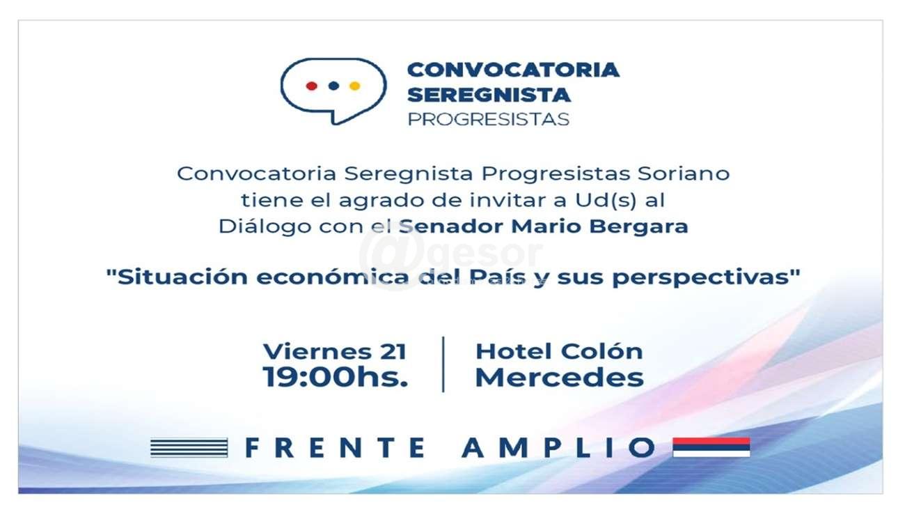 Convocatoria Seregnista Progresista de Soriano invita  al Diálogo con  el Senador  Mario Bergara.  El  tema será Situación económica del país  y sus perpectivas.