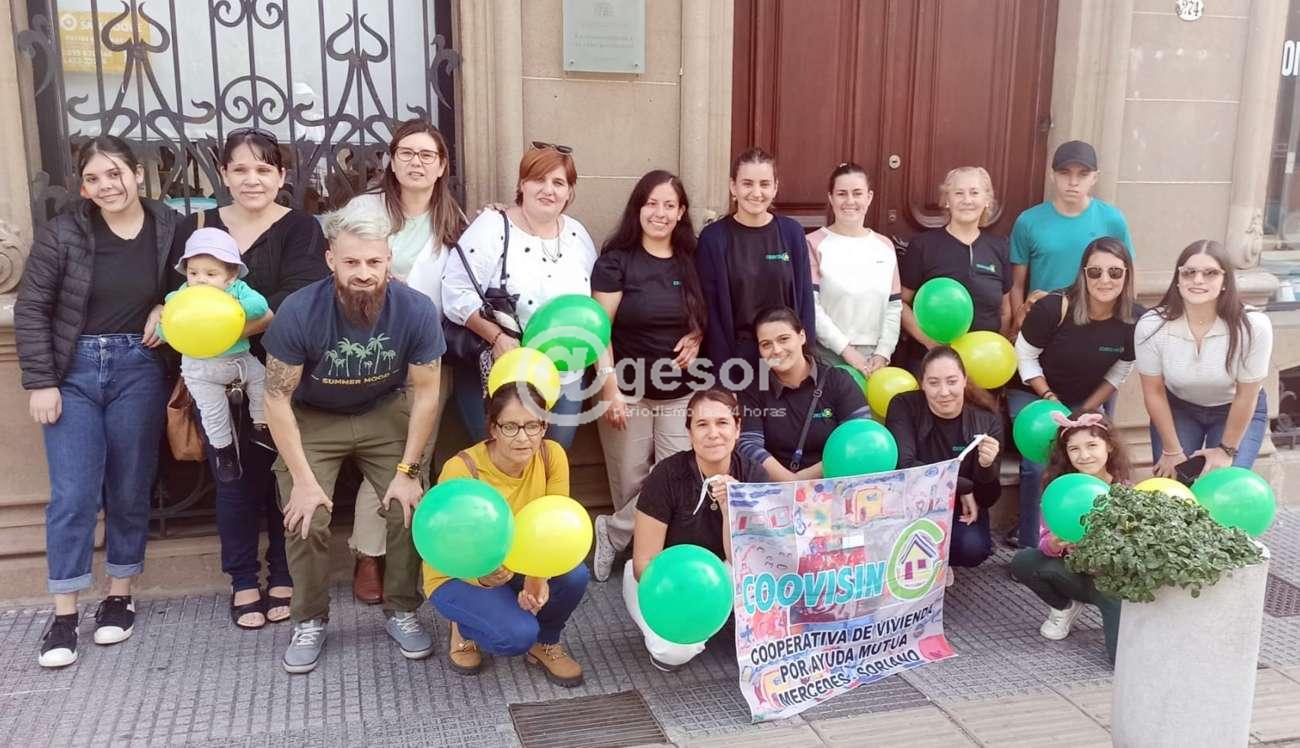Después de casi 13 años de su formación como cooperativa, una de las seis COOVISIN en la tarde de este lunes 24 de abril dio un paso más hacia el sueño del techo propio tras muchos escollos en el camino y muy duros varios de ellos, que igualmente han logrado superar para llegar a la instancia de escriturar el terreno ubicado en la zona Sur de Mercedes, más precisamente en lo que fuera la chacra de Miguel Racioppi, adquirida a sus sucesores, donde COOVISIN C a través de sus autoridades actuales estampó su firma y recibió el dinero para la compra del predio donde levantará sus 40 unidades habitacionales y eso mereció que la mayor parte del grupo -al menos algún representante de cada familia- se hiciera presente frente al local de la Agencia Nacional de Vivienda (ANV) en Mercedes para acompañar a quienes debían firmar y celebrar juntos esta instancia que les permitirá en los primeros días de mayor comenzar con la etapa de obra.