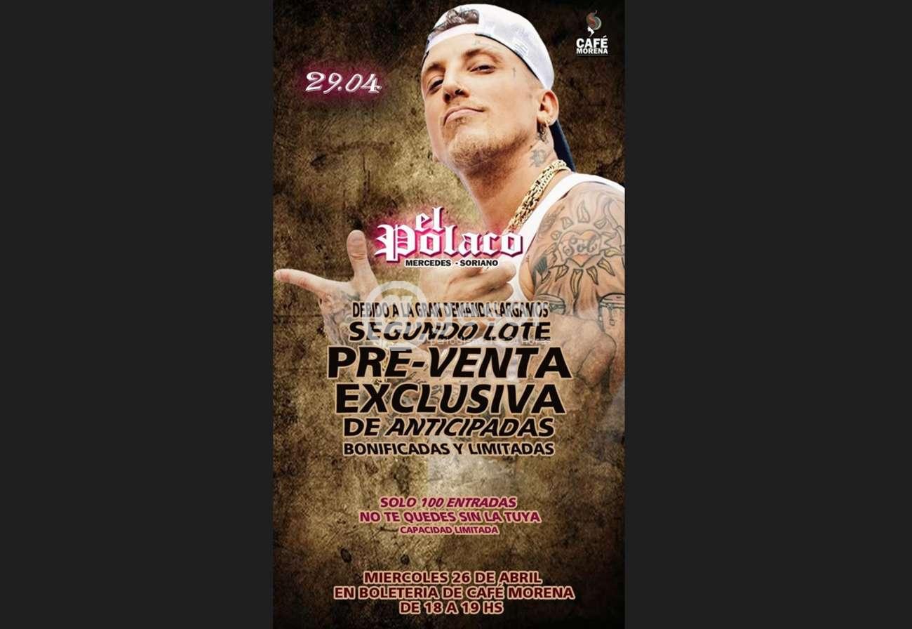 Como adelantáramos, este sábado 29 de abril MERCEDES recibe en CAFE MORENA (Giménez y 28 de Febrero) el show espectacular de EL POLACO!!! Y la organización acaba de comunicar que debido a la gran demanda por ver al artista argentino, se pone a la venta un segundo lote en pre-venta exclusiva de anticipadas bonificadas y limitadas, serán 100 entradas a colocarse en boleterías de CAFE MORENA este miércoles 26 de 18.00 a 19.00 horas. No te quedés sin la tuya!!!